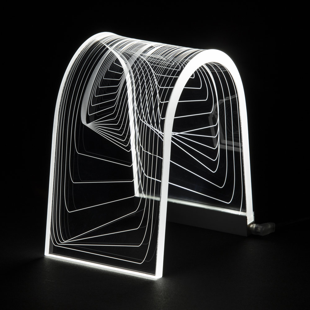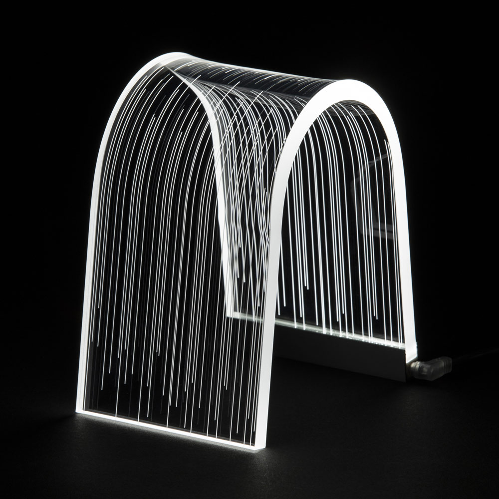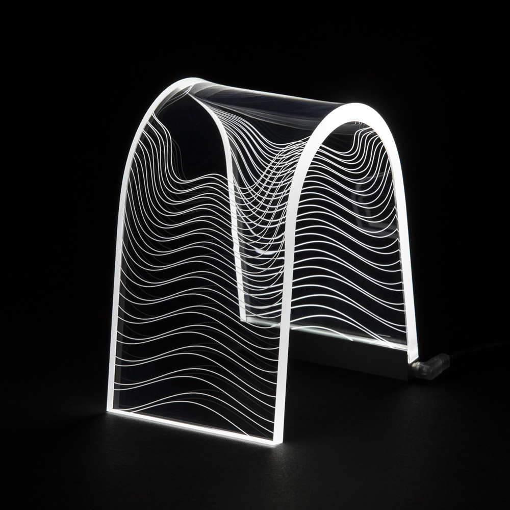 Bågstödslampa i akrylkristall och lasergraverade dekorationer, 2 storlekar tillverkade i Italien.