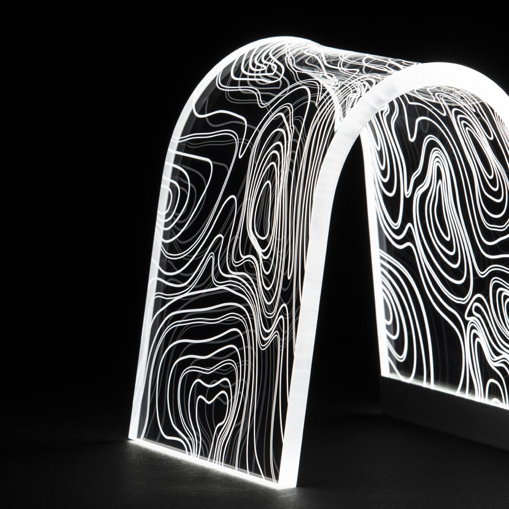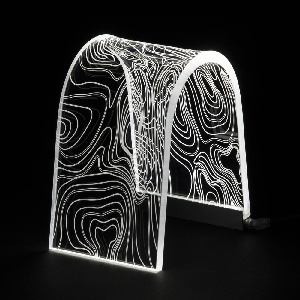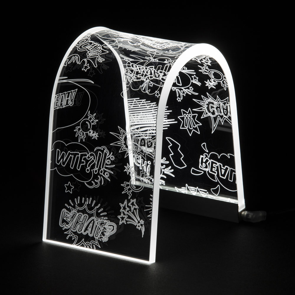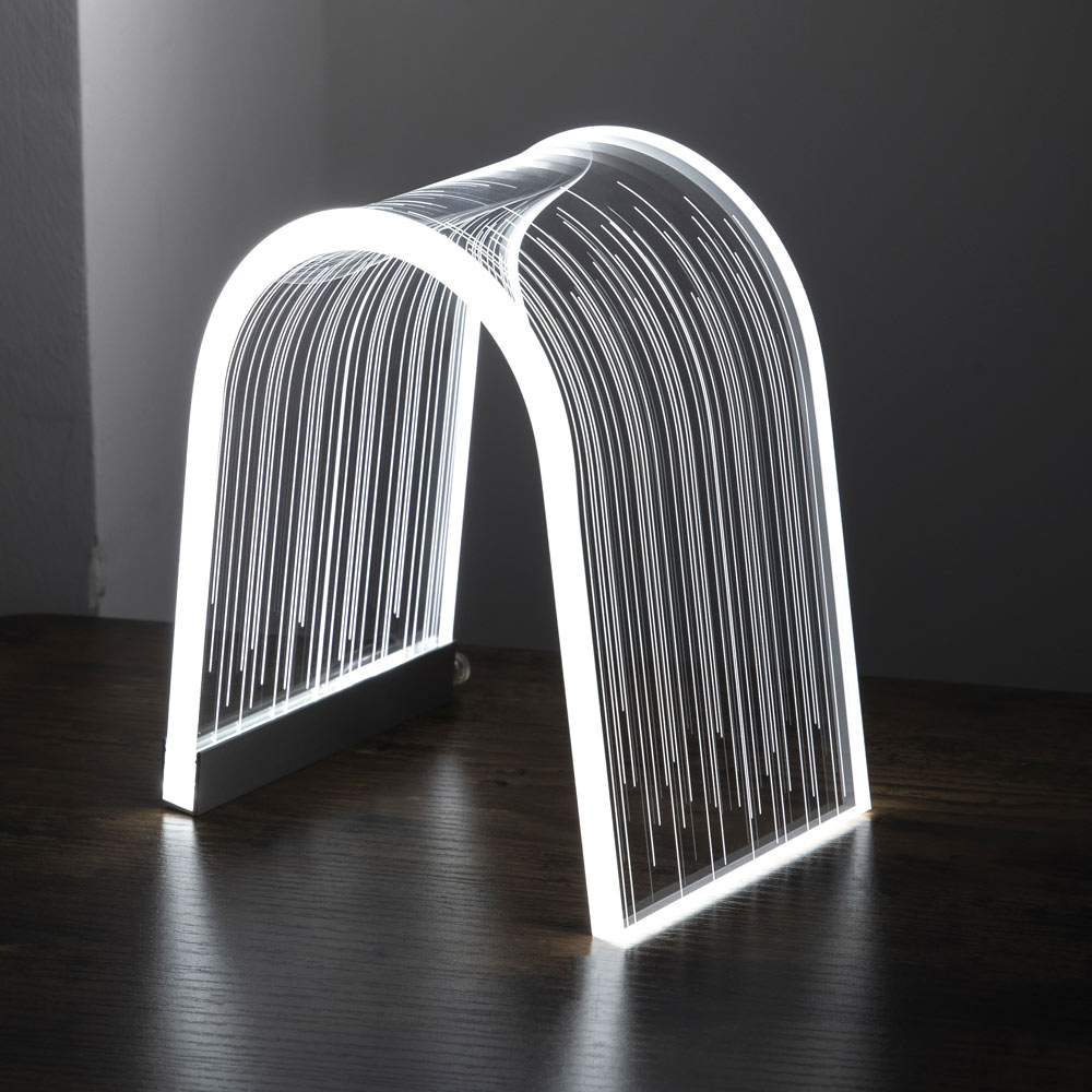 Bågstödslampa i akrylkristall och lasergraverade dekorationer, 2 storlekar tillverkade i Italien.