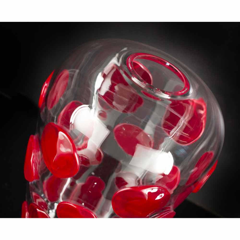 Elegant vas för interiörer i genomskinligt Murano-blåst glas med runda detaljer i ljusrött tillverkat genom en process helt tillverkad i Italien . Ett komplement som kombinerar den extrema elegansen i Murano-glaset och dess underbara detaljer med en modern och livlig design för att ge liv åt en idé om exklusiva och avantgardistiska möbler som kan berika alla inhemska utrymmen och inte med en touch av färg . En idealisk stil för de mest varierade miljöerna, från heminredning till hotell, restauranger, kontraktsområden, spa men också som en miljö för evenemang och bröllop.
