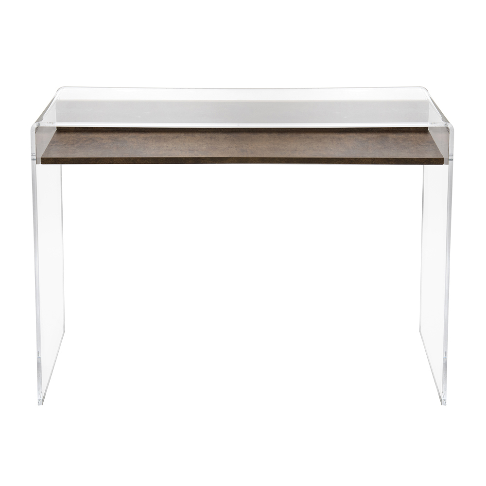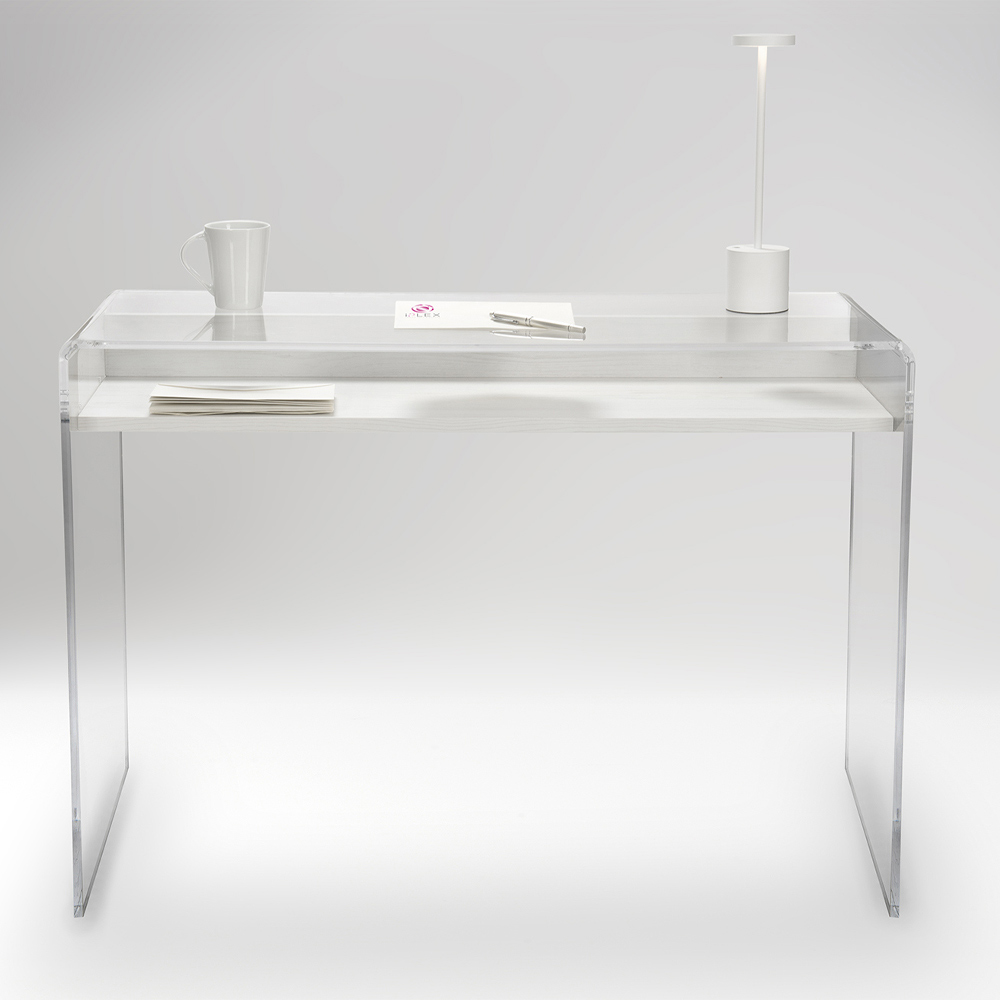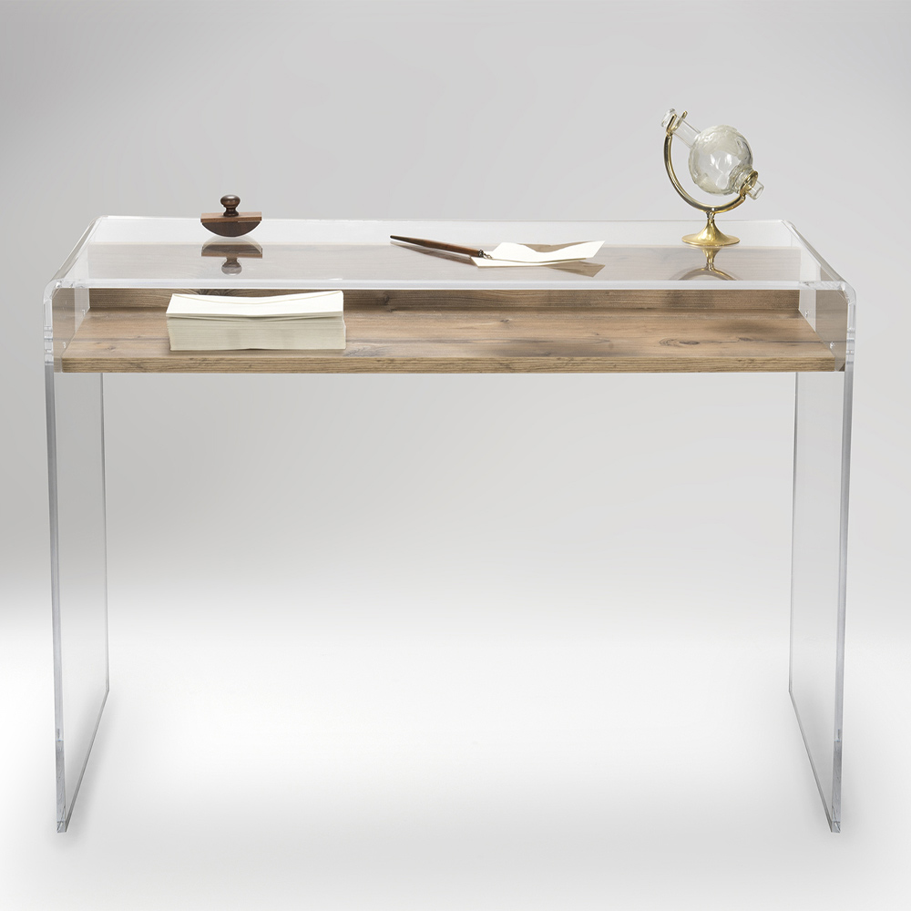 Modern designkonsol i laserskuren transparent plexiglas med trähylla, design tillverkad i Italien.