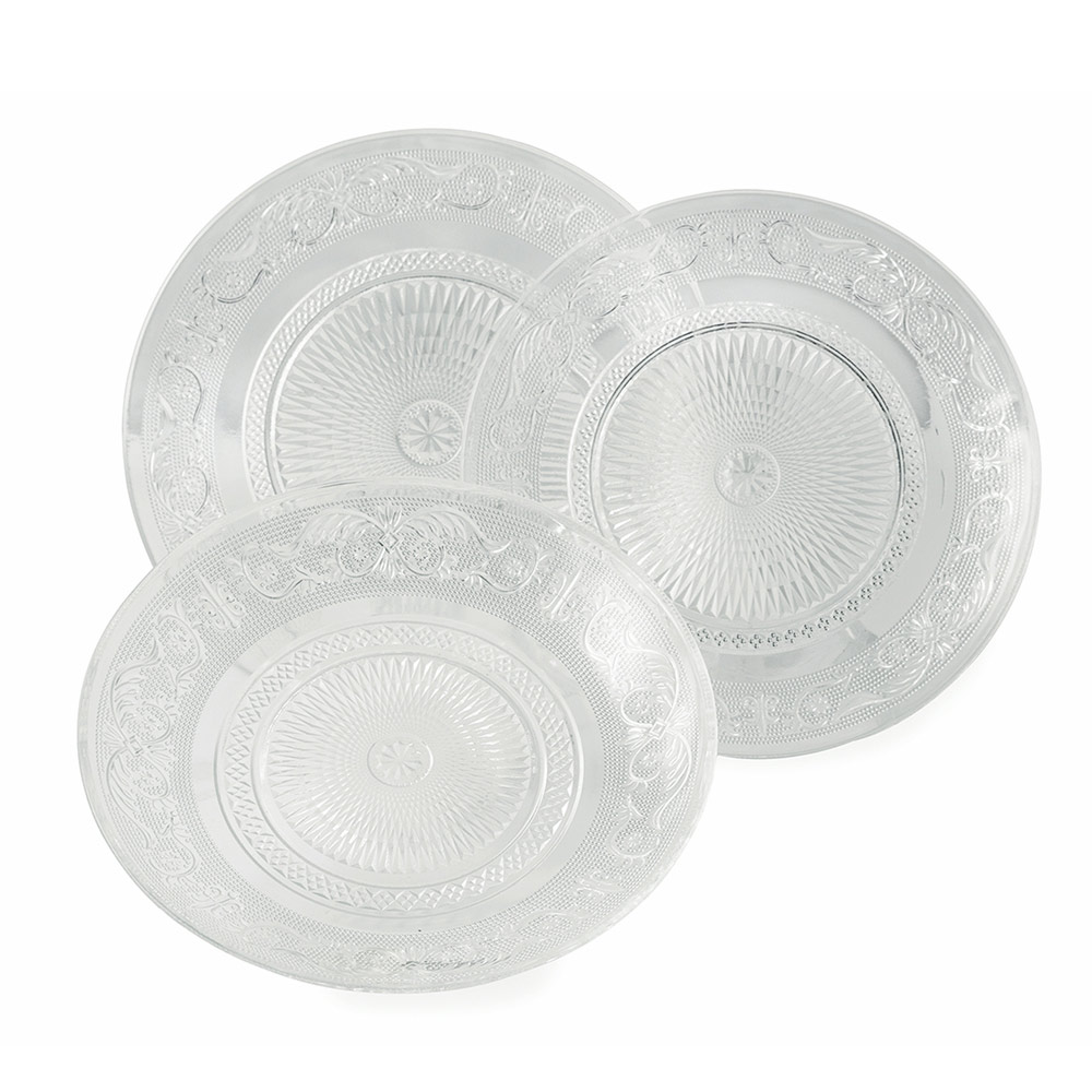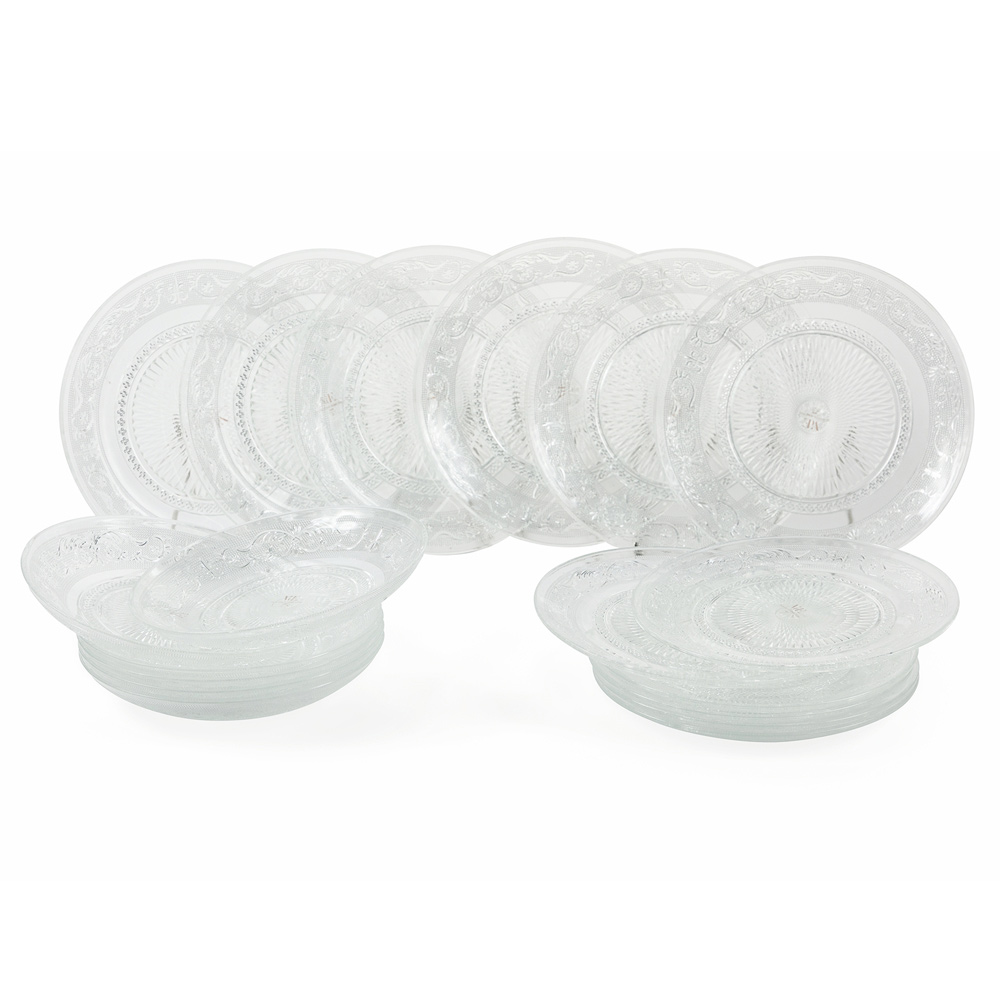 Uppsättning av 18-delade dekorerade genomskinliga tallrikar.
