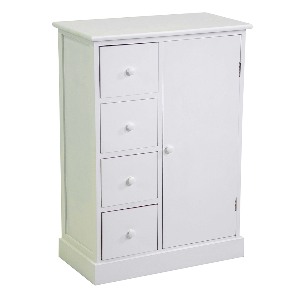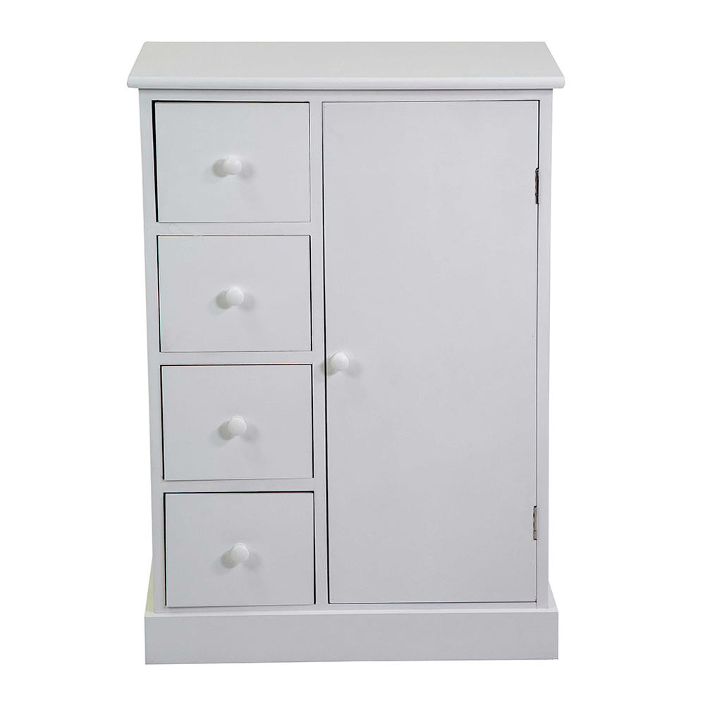 Med 4 sidolådor och 1 dörr erbjuder det en stor förvaringslösning som är perfekt för förvaring av vardagliga föremål, redskap, textilier eller dokument, så att allt hålls städat och utom synhåll. De rena linjerna och den minimala designen gör det extremt mångsidigt: perfekt för vardagsrum, sovrum, badrum eller entréer.
