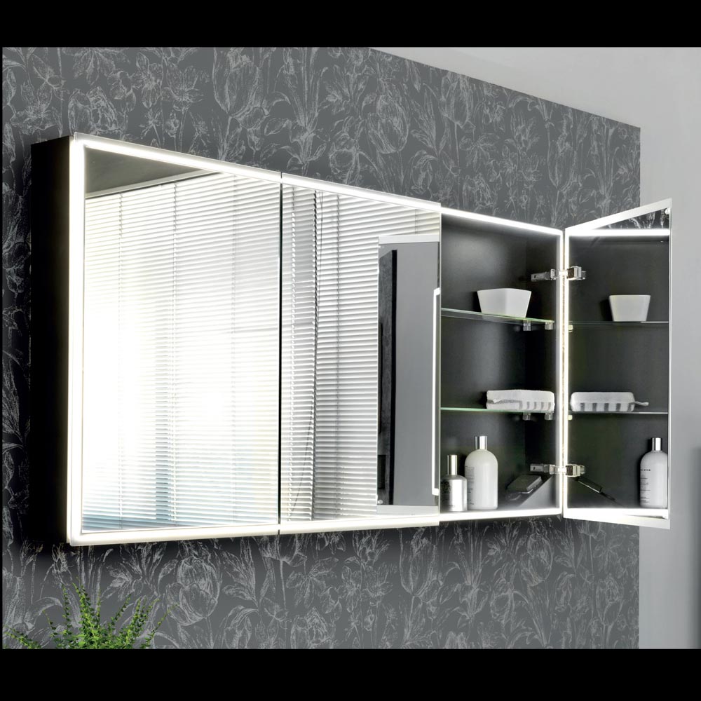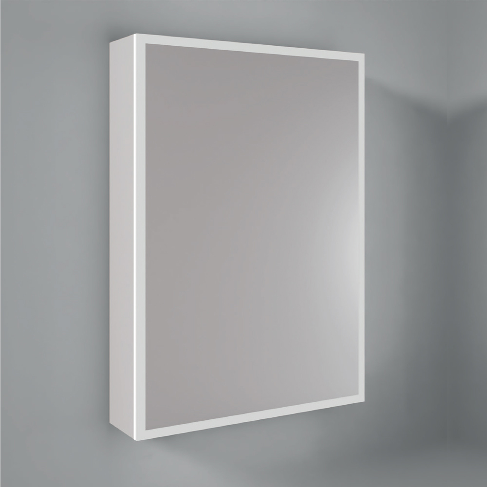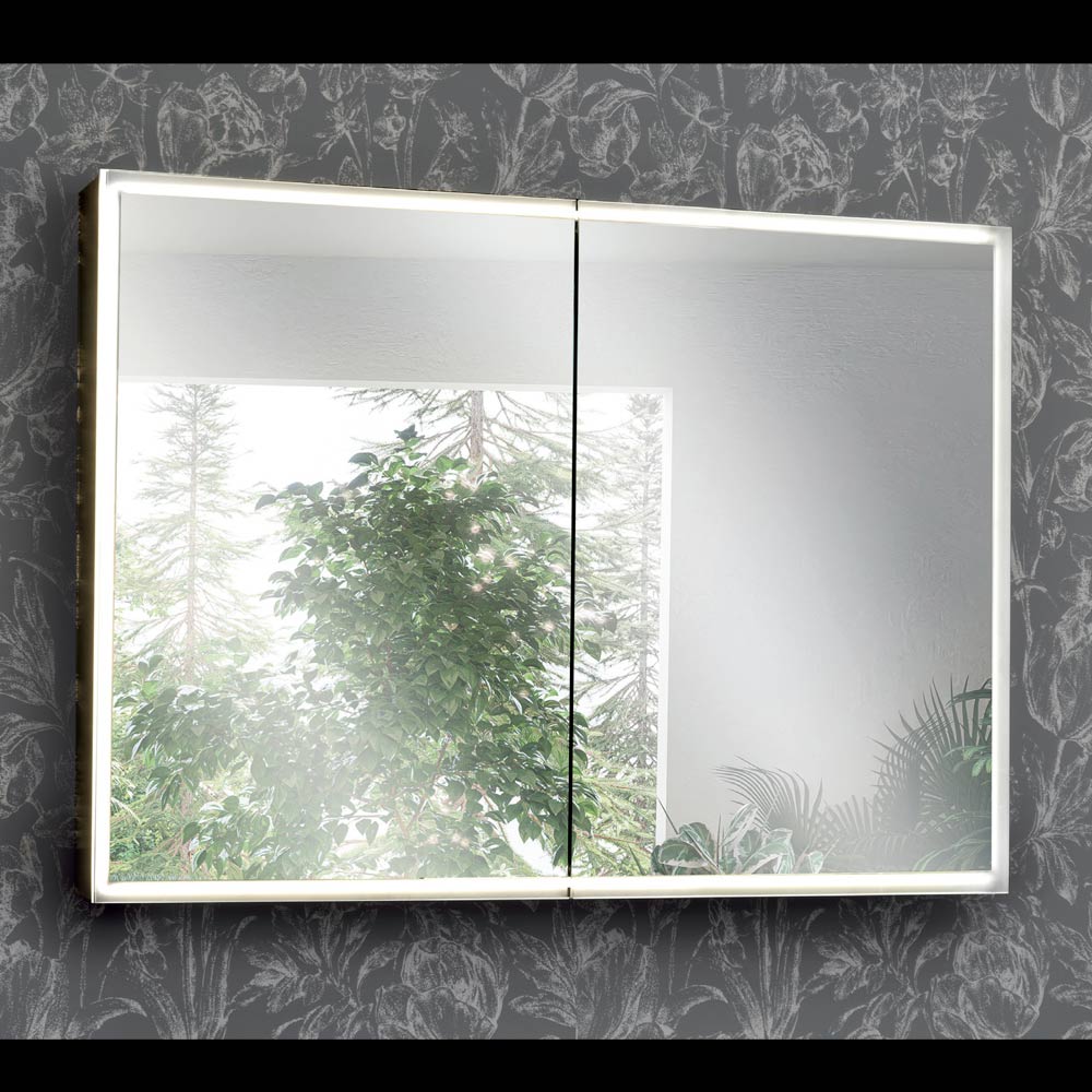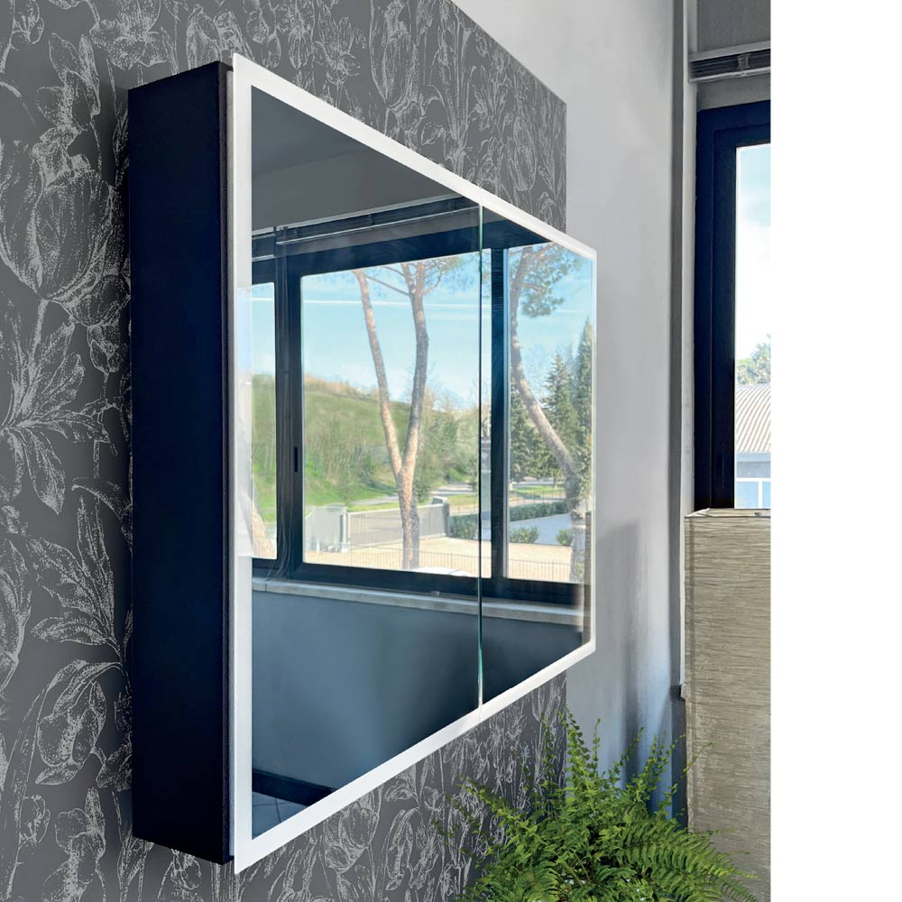 De dubbla spegeldörrarna öppnas för att avslöja ett rymligt inre område, perfekt för att hålla ordning på alla dina personliga vårdprodukter. LED-lampan framhäver inte bara designen utan ger även funktionellt ljus, vilket gör det perfekt för smink, hudvård eller som extrabelysning i badrummet.