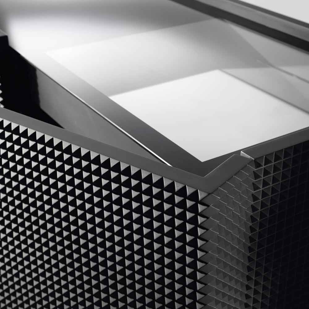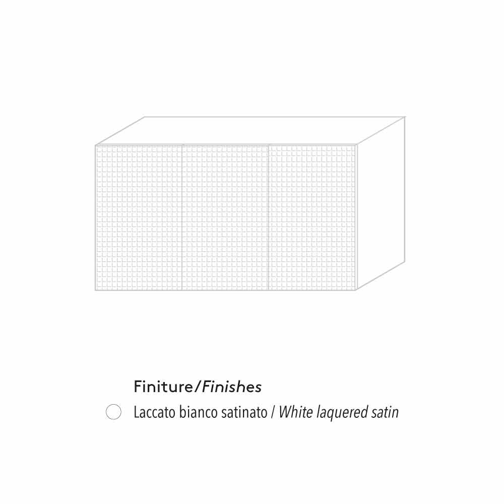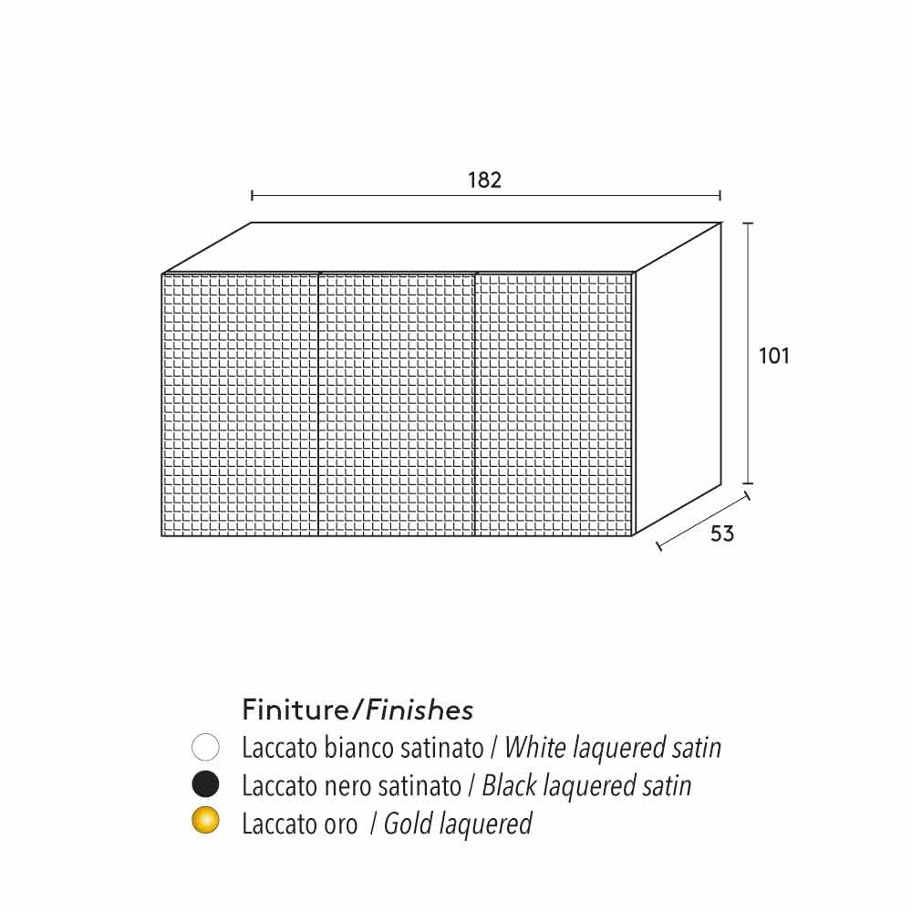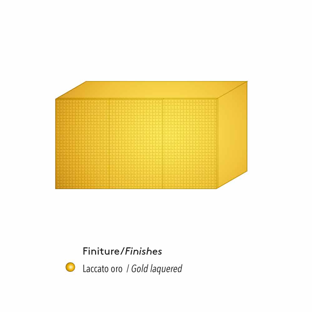 Skänk med 2 dörrar öppna på sidorna och ett centralt extraherbar låda utrustad med topp i målat glas. Inuti finns 2 glashyllor. Tillgängliga finish: satin vit lack, satin svartlackerad eller guld.