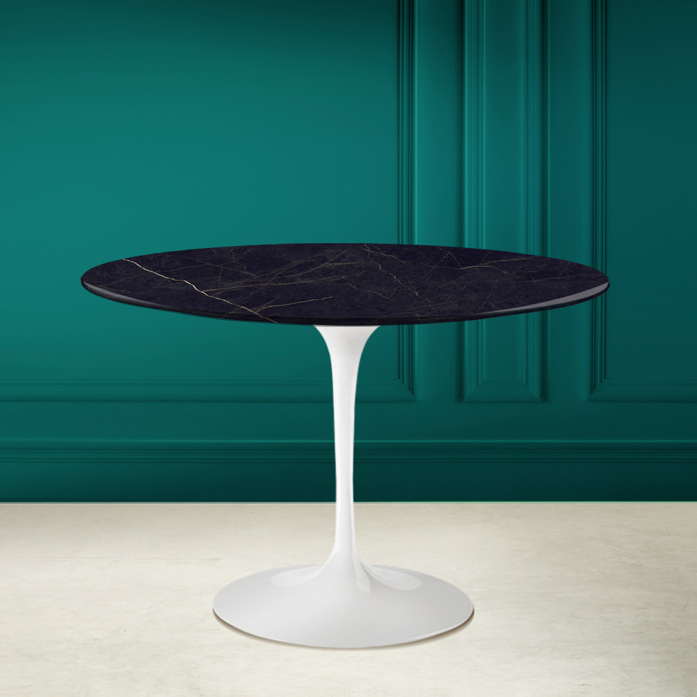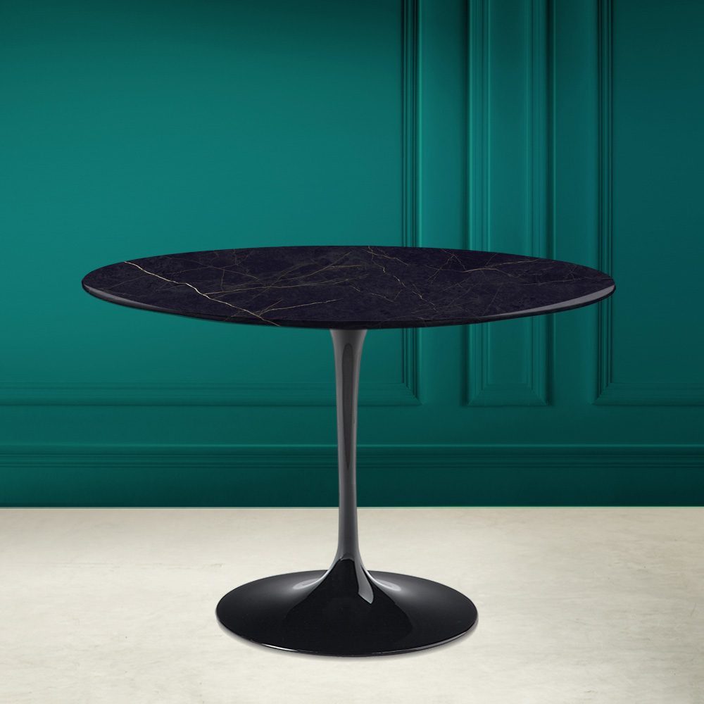 Matbord med rund skiva i noir laurent keramik och underrede i polerad aluminium Made in Italy