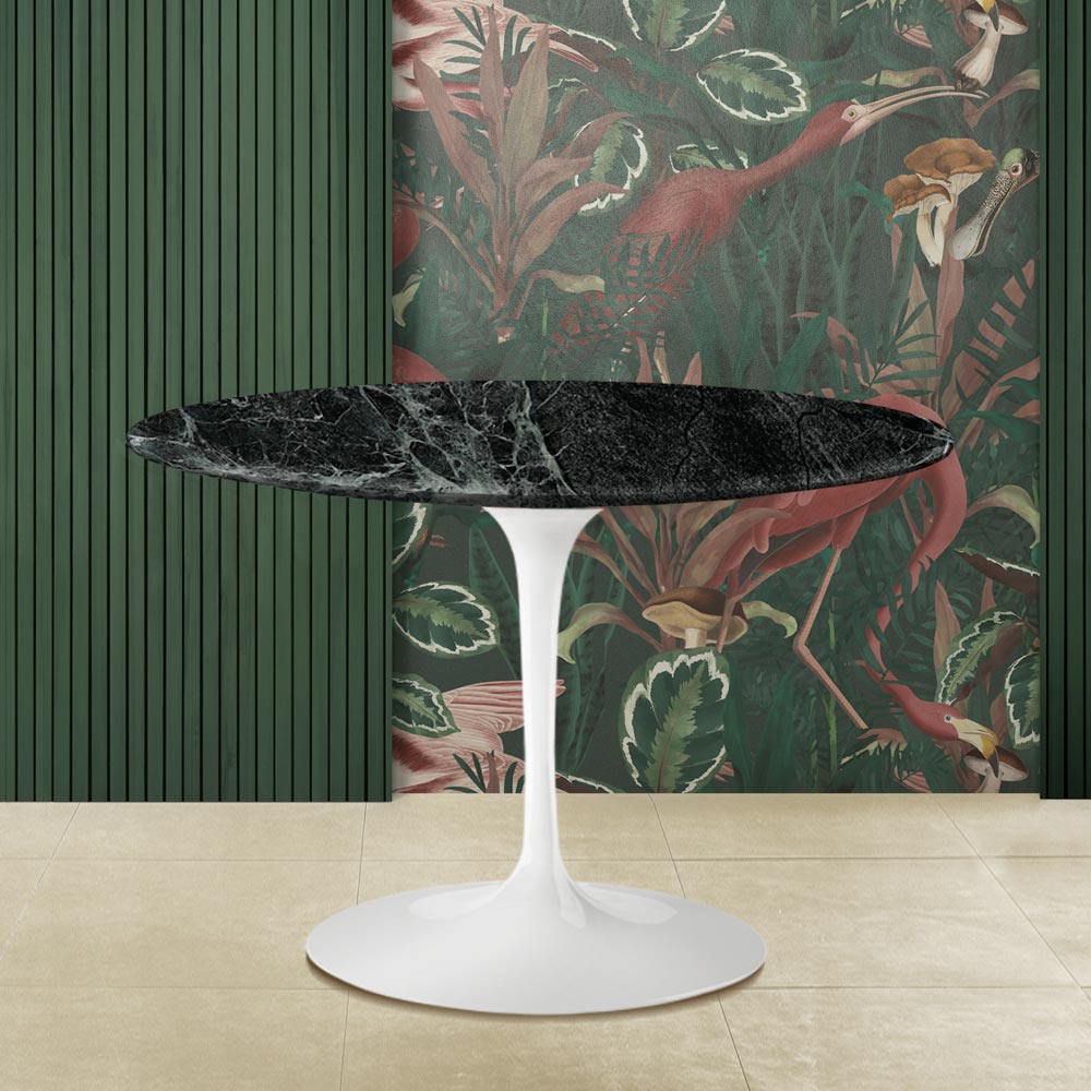 Runt matbord med skiva i grön alpmarmor och underrede i polerad aluminium Tillverkad i Italien