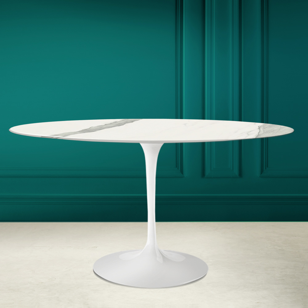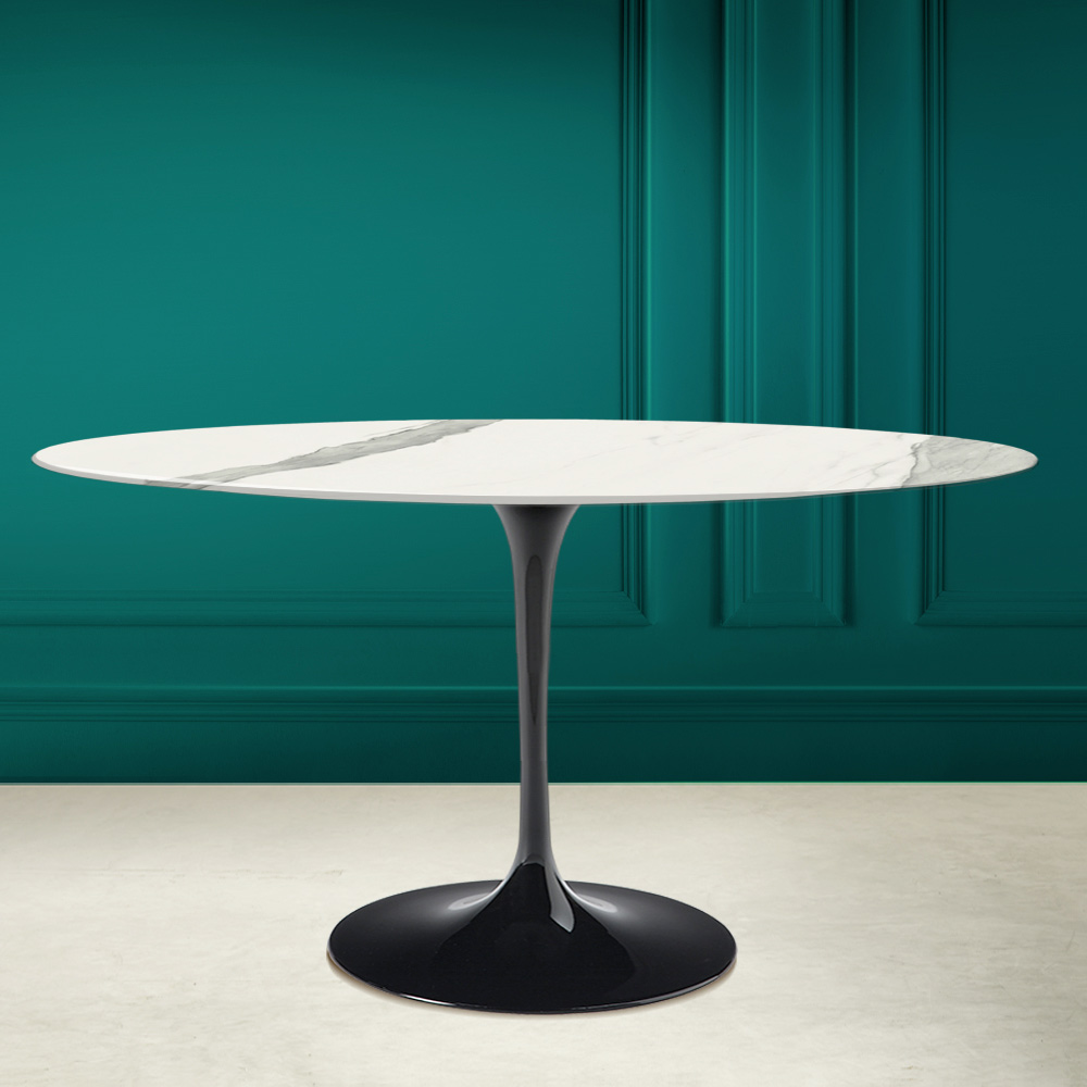 underrede i polerad aluminium. Detta bord är det perfekta elementet för att ge en originell touch till vardagsrum och kök tack vare den ovala formen och statuario fulvein-keramiken. Den