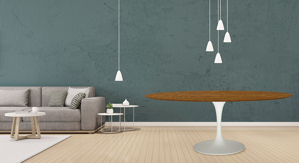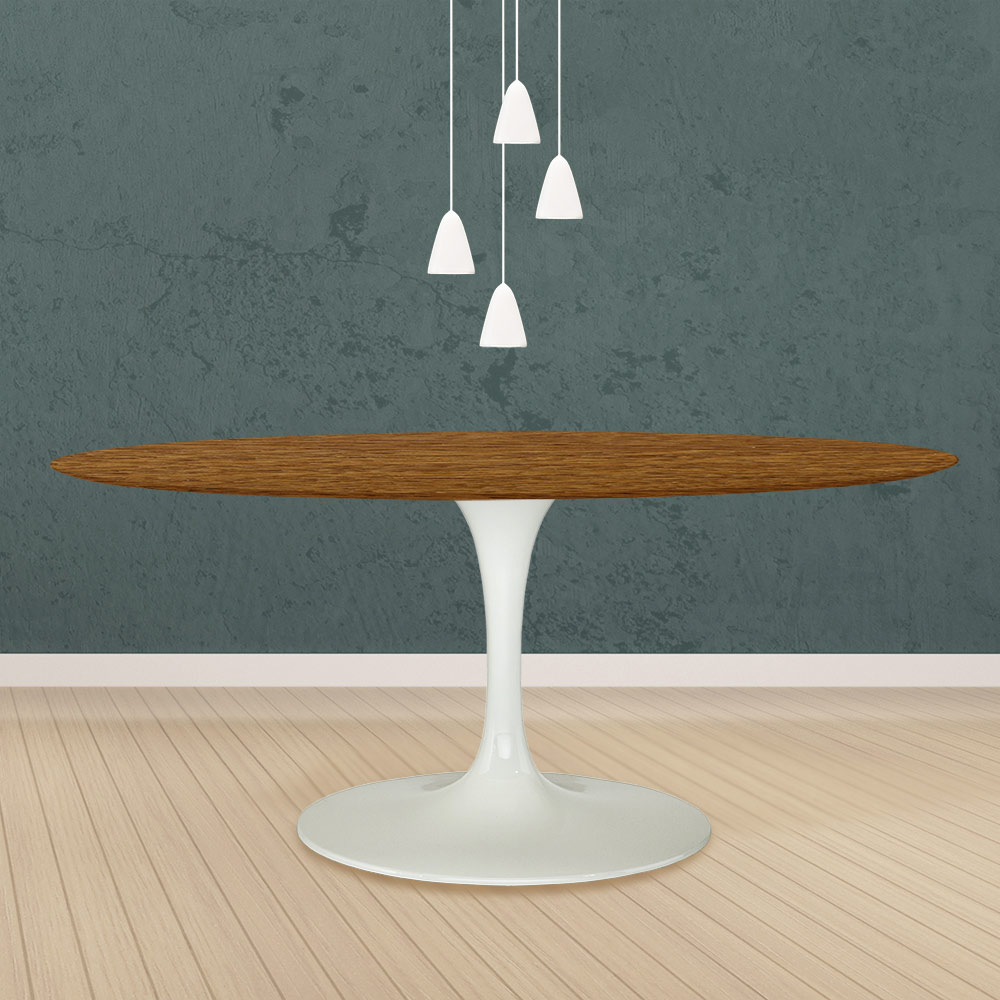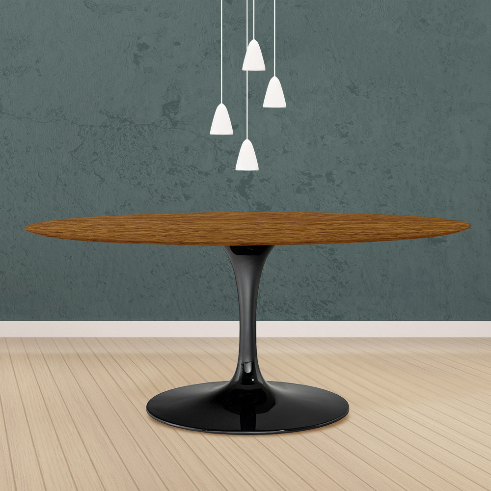 ovala formen och den ljusa valnötsbetsade ekskivan ger detta bord en