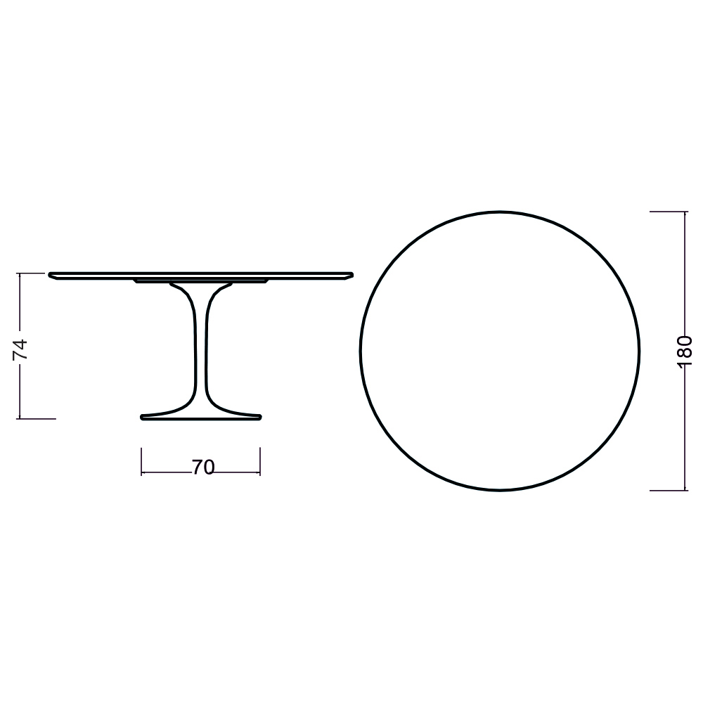 - Bordskiva diameter 180 x höjd 74 cm / Underredets diameter 70 cm