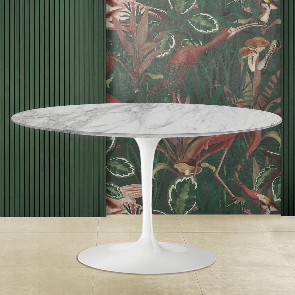 ovala formen och den arabeskmarmor som används för att skapa toppen. Den ovala formen används allt mer för att ge rummet en touch av unikhet och finess och här kombineras den med de