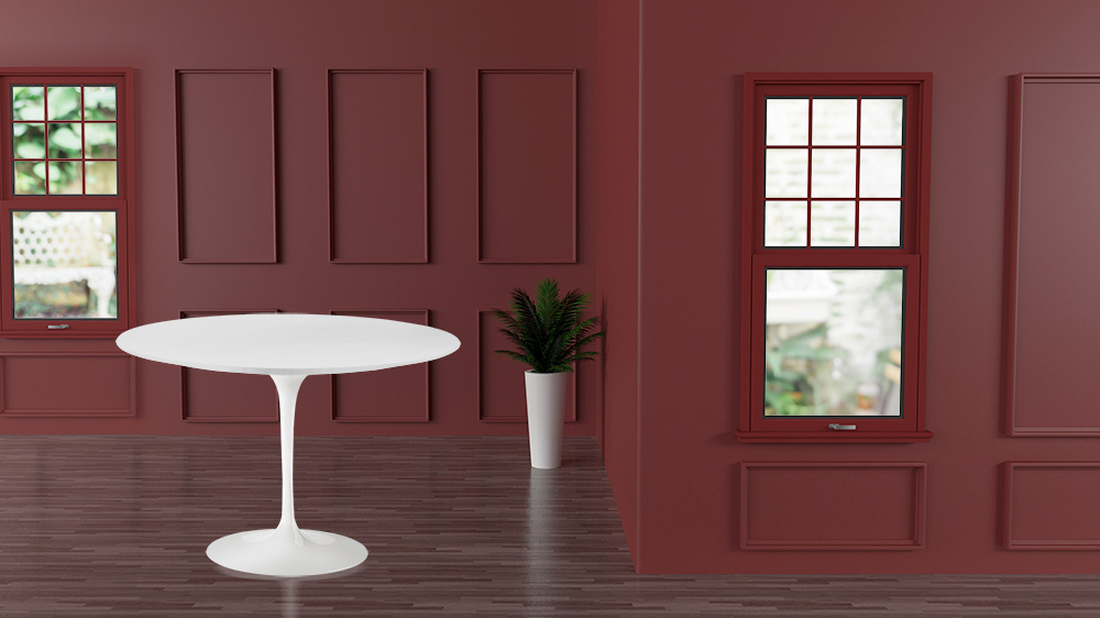 Rundt matbord med skiva i vit flytande laminat och underrede i vitpolerad aluminium tillverkat i Italien