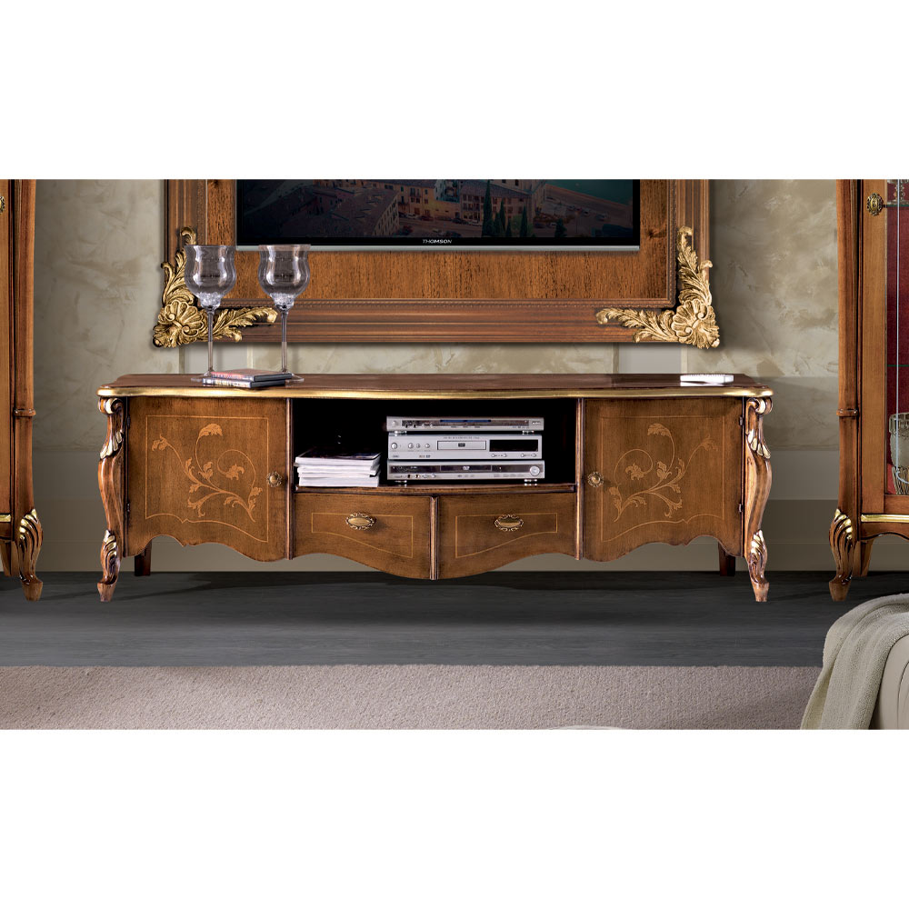 Klassisk TV- bänk för vardagsrummet med 2 dörrar, 2 lådor och 1 fack, tillverkad av Bassano-valnöt med antik gulddetaljer. Ett unikt och raffinerat verk, helt tillverkat i Italien av skickliga hantverkare , mästare inom konst som utför varje verk med expertis och elegant finish. Produktionen utförs med högkvalitativa material och handgjord med den största omsorg och professionalism som utmärker Made in Italy -produkter.