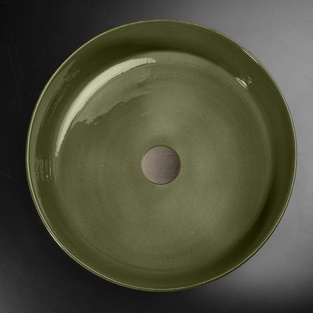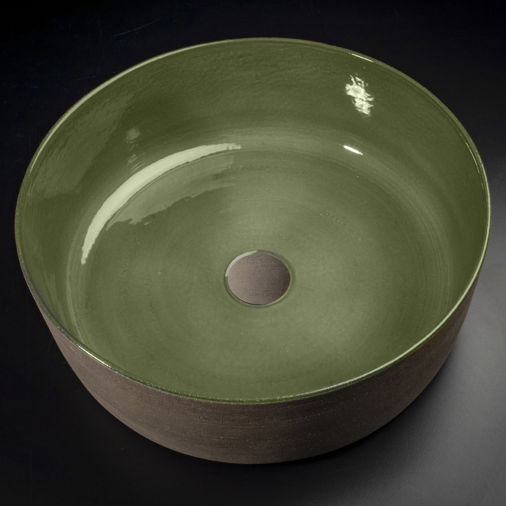 Bänkskiva tvättställ med rund form tillverkad i Italien i eldfast lera , vänt för hand med tredje eldslagning. Dess estetik kännetecknas av den perfekta kombinationen av den naturliga vaxade och vattentäta exteriören med en mer rustik stil och den glänsande och förglasade interiören i en grön finish, en färg som påminner om våren och växternas blomning, vilket för tillbaka till den ursprungliga kontakten med naturen ... Varje element i tvättstället är handgjort för att ge liv åt en exklusiv inredningslösning, av högt värde och av oöverträffad kvalitet.