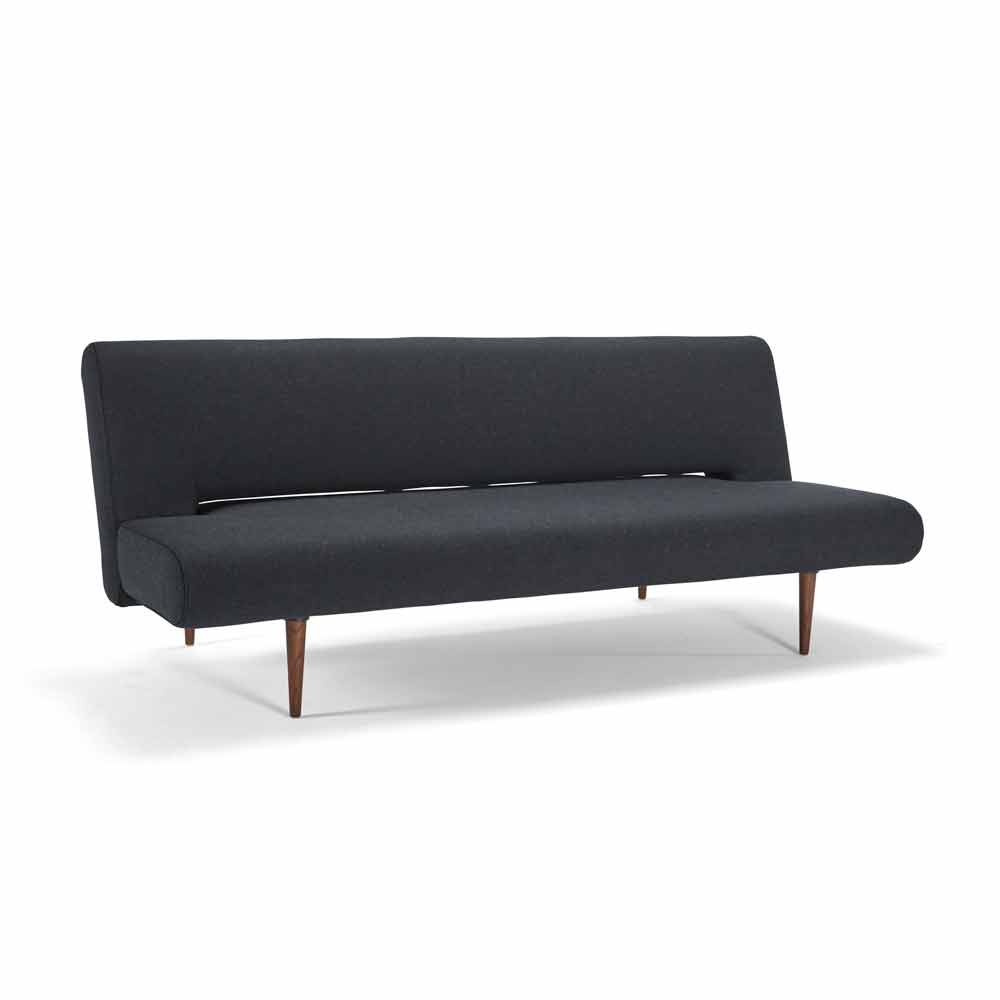 Unfurl är bäddsoffan som har en matt svart stålkonstruktion och mörkt färgade träben.