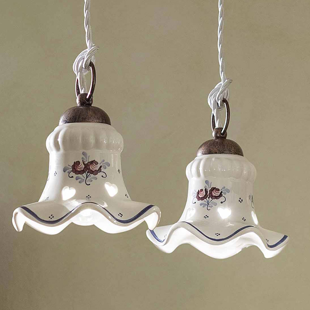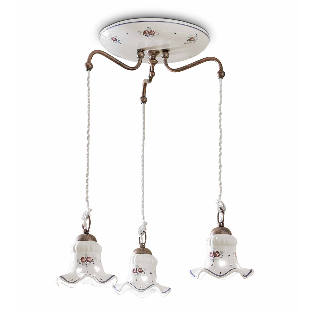 Rund pendellampa 3 lampor i järn och handdekorerad keramik, tillverkad i Italien av Ferroluce.