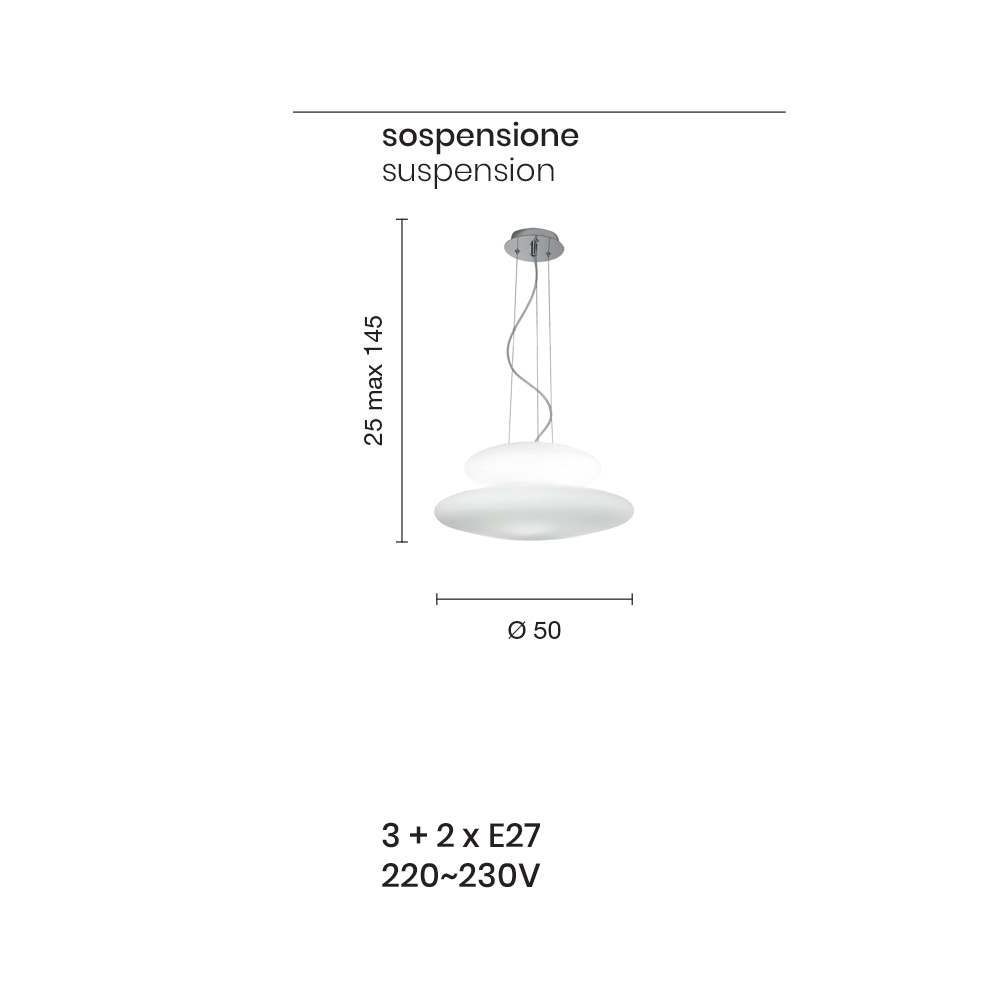 - diameter 50 x H 25 cm - H max 145 cm (3 + 2 x E27 220-230V).