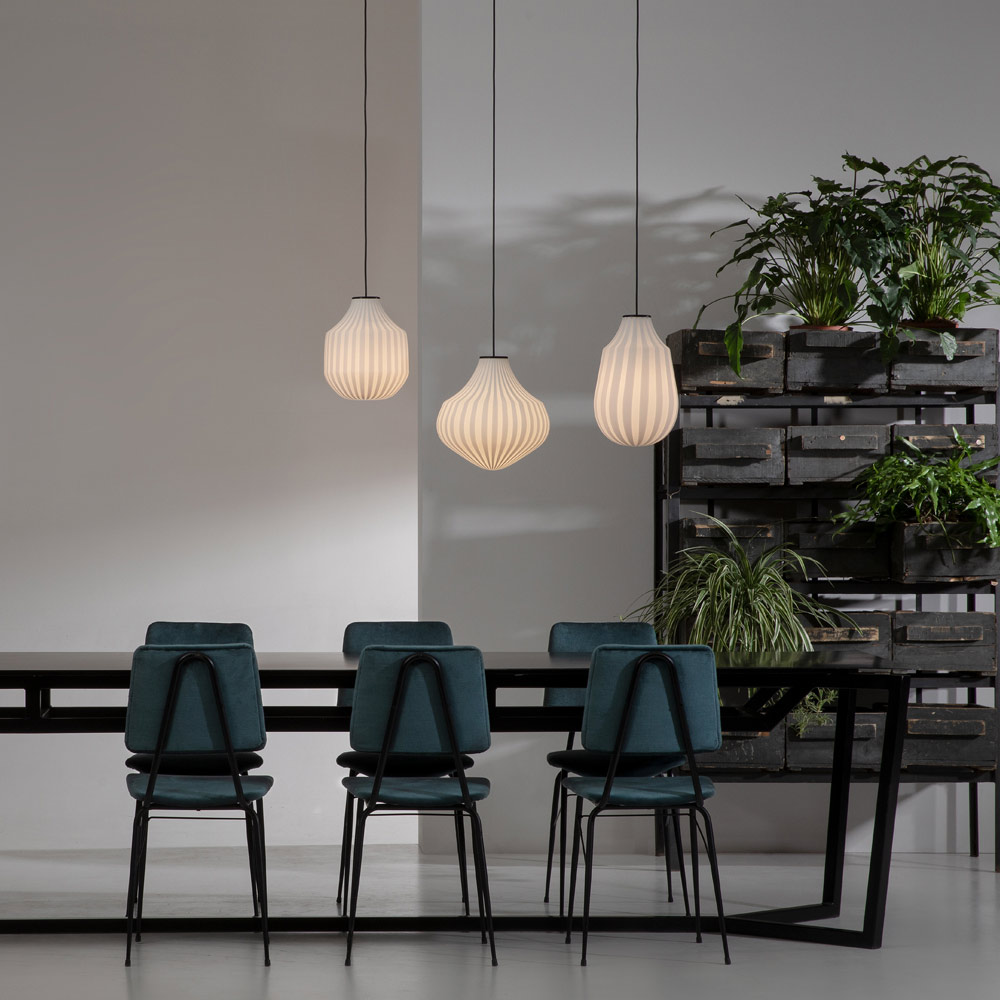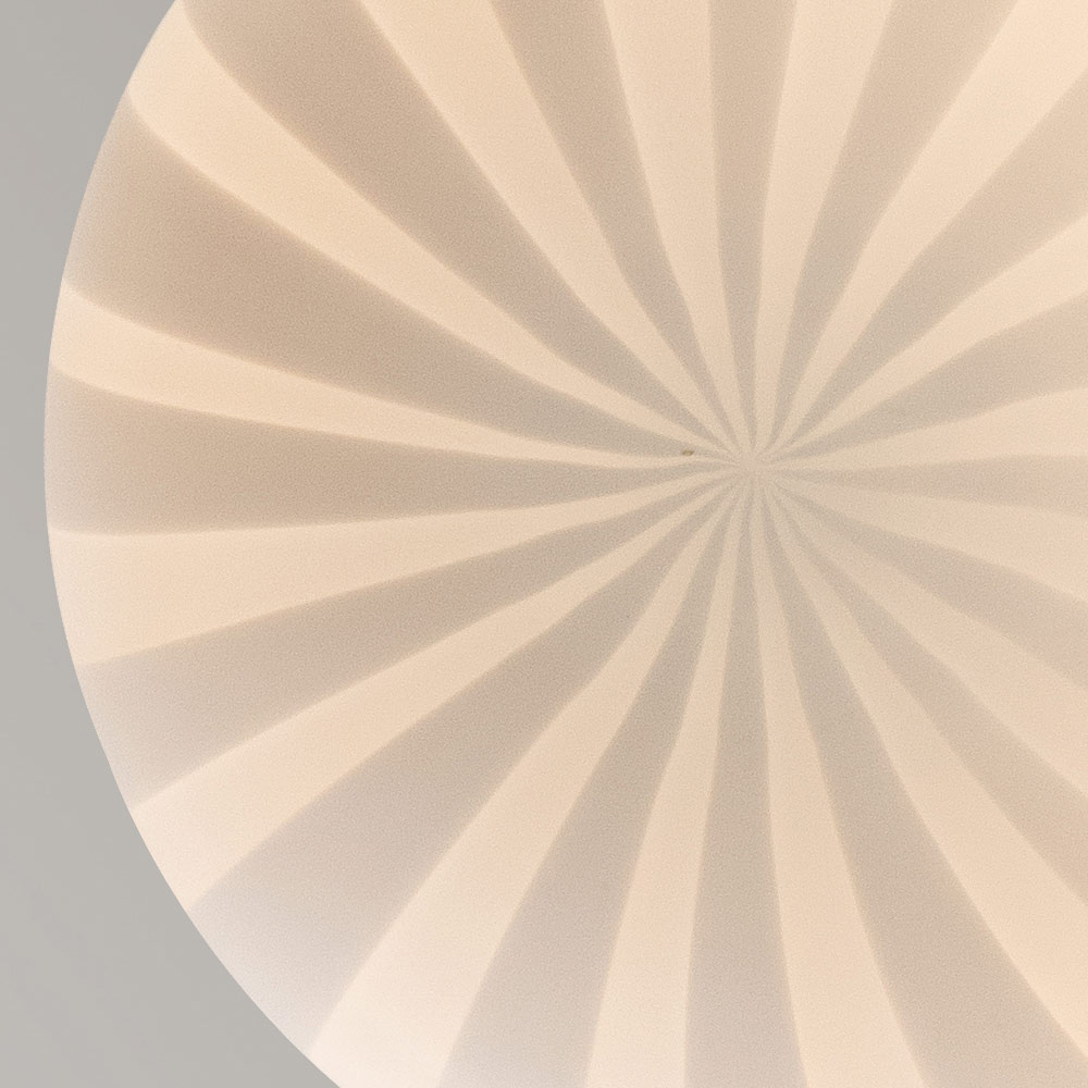 Lampan är tillverkad med en vit filigranglasdiffusor genom hantverk , ett material som ger lyster och modernitet till ljuset, som passerar genom det och skapar sublima och engagerande atmosfärer, och en avtagbar aluminiumsockel.