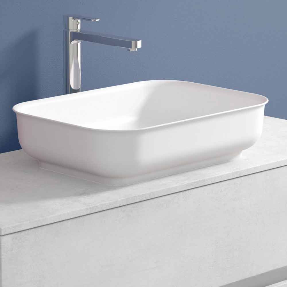 Den rektangulära bänkskivan tvättställ är gjord av Solid matt, en opak vit mineral harts, och slutade i opak gelcoat, vilket gör produkten vattentät.
