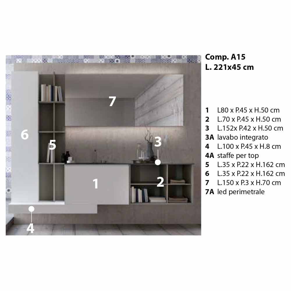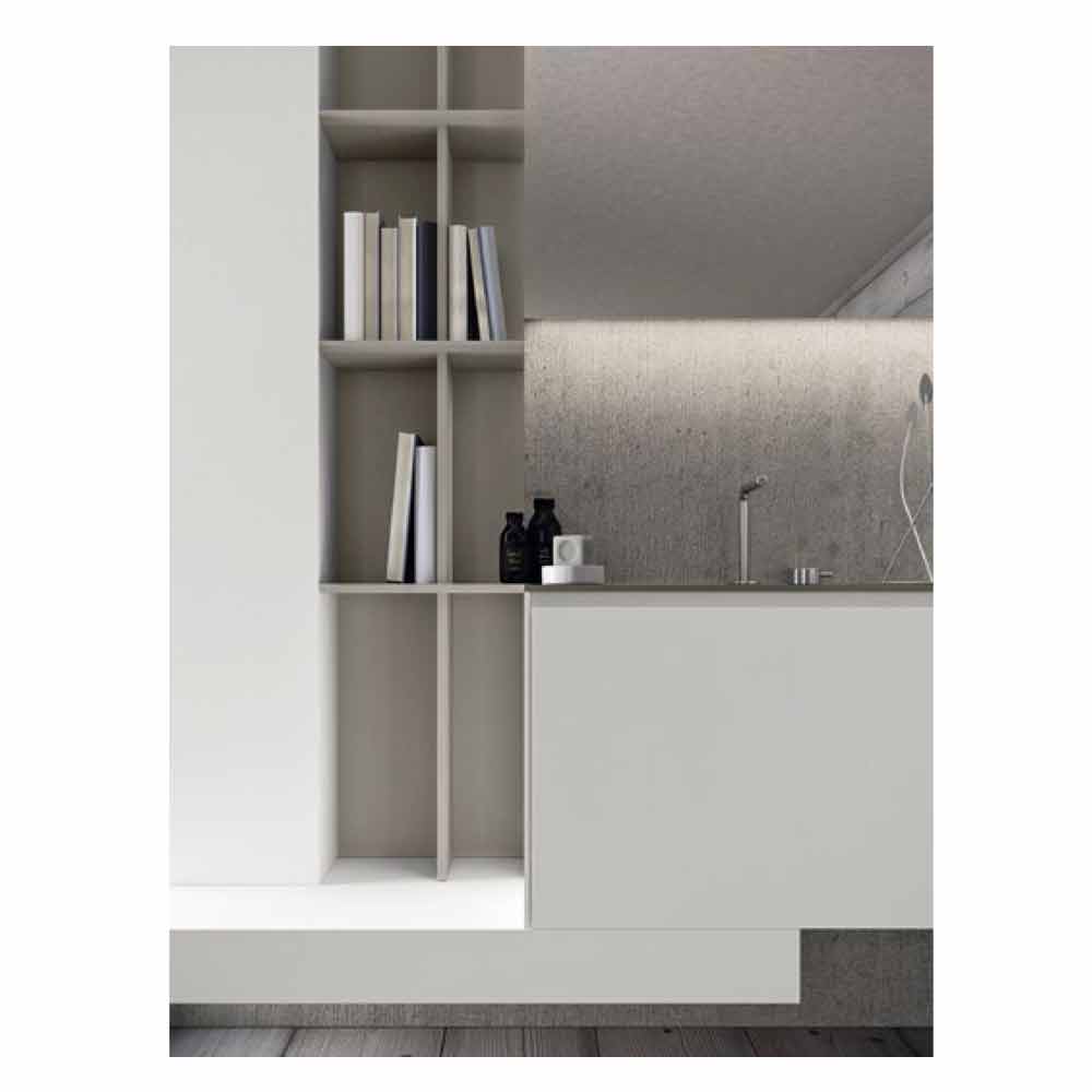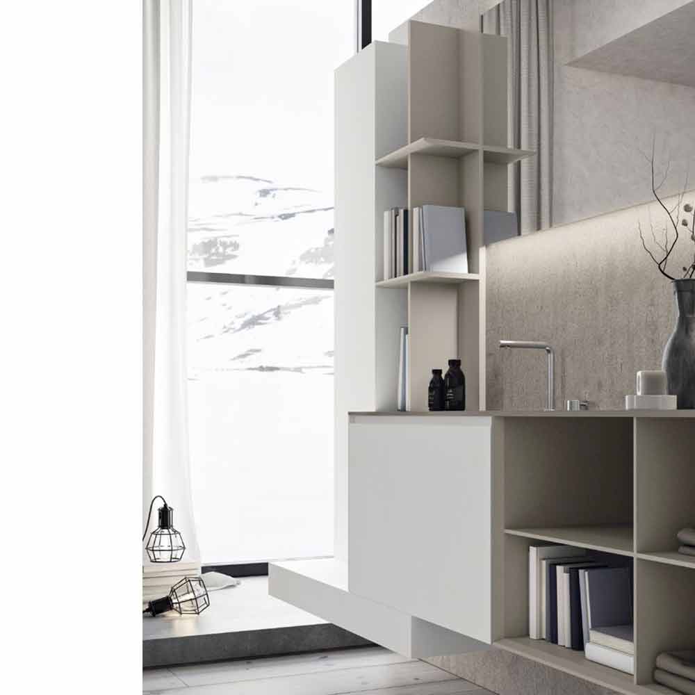 Modern hängande badrumskomposition, vanlig design med öppna hyllor, tillverkad i Italien.