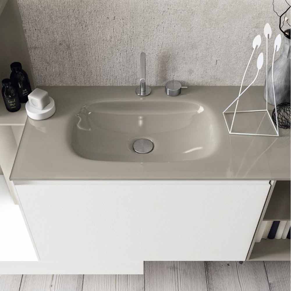Badrumsmöbler i stenvitt HPL , integrerat handfat i blankt ljusgrått glas , spegel med LED-belysning, öppna element i matt ljusgrå lack.
