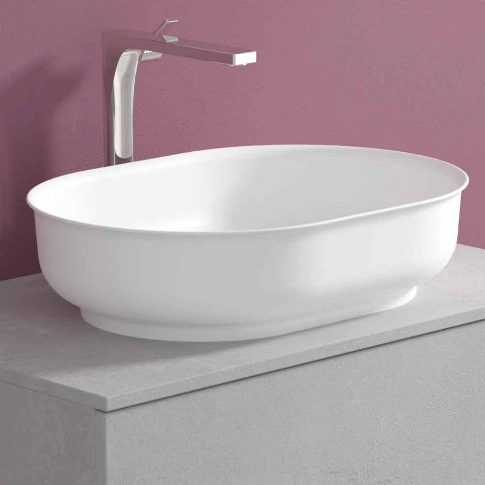 Den ovala-formade bänkskivan tvättställ är gjord av Solid matt, en opak vit mineral harts, och slutade i opak gelcoat, vilket gör produkten vattentät.