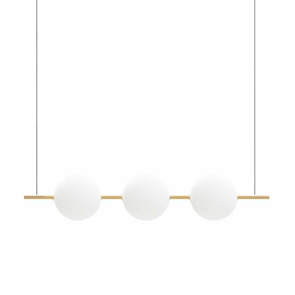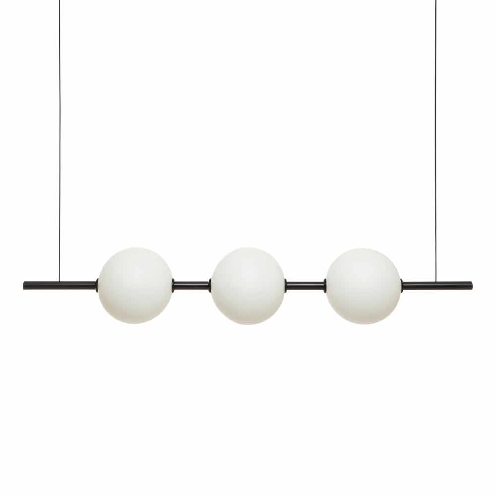 Hängande lampa i svart eller borstad mässing med tre borosilikatglas sfärer, tillverkad i Italien.