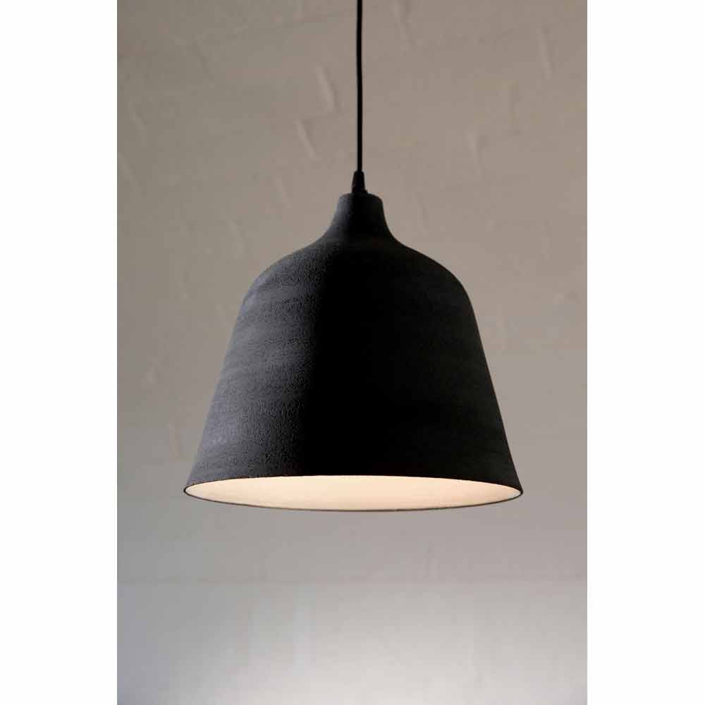 Lampan är gjord av matt antracit stengods, ett kompositionskontinuitetsmaterial som skiljer sig från keramik för större motståndskraft mot atmosfäriska medel, eld och termiska chocker. Vit emaljerad interiör.