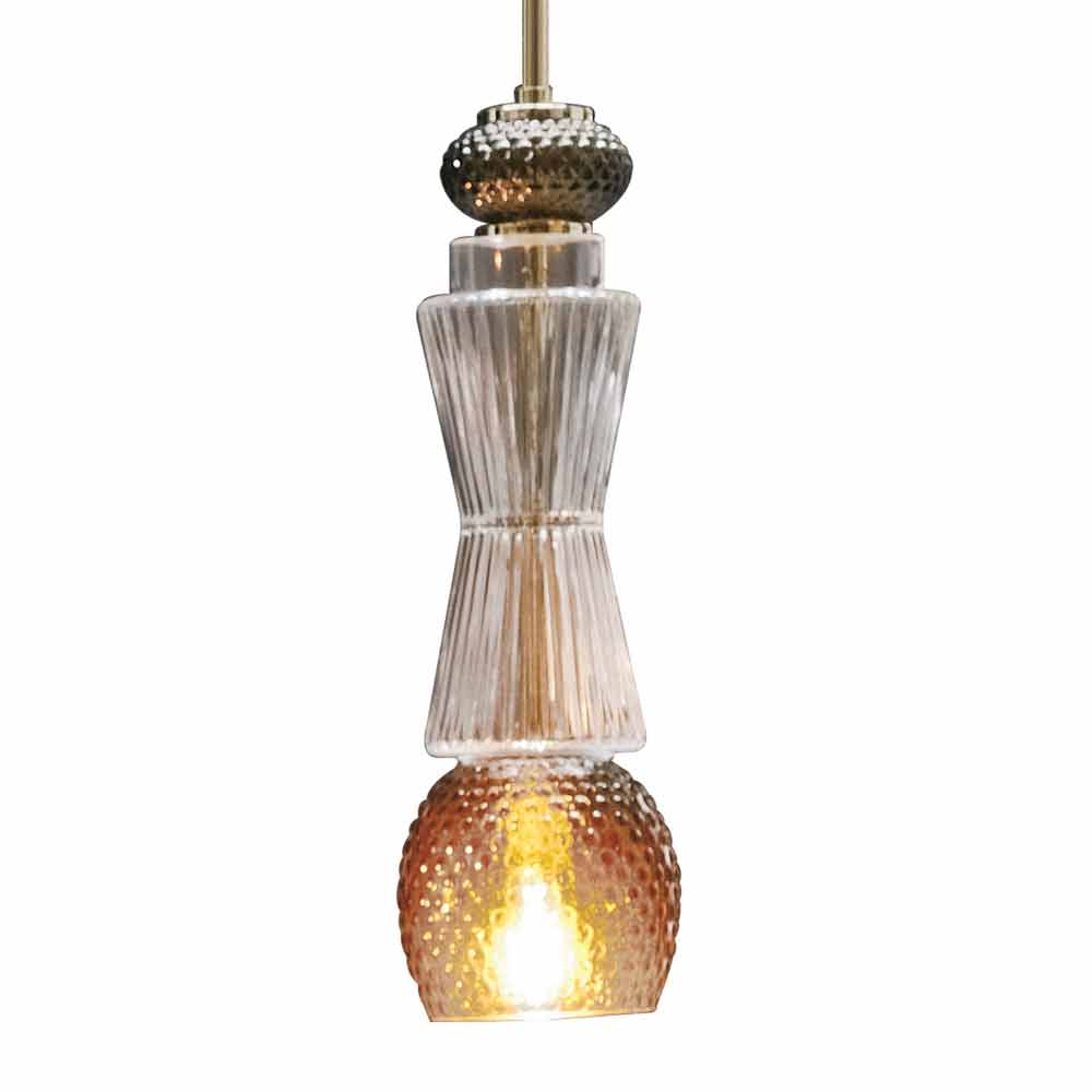 Upphängningslampa i Murano-glas med antik dekor, detaljer i guld- och antracitkabel , tillverkad i Italien. Mötet mellan den tidlösa elegansen i Murano-glaset och den raffinerade beröringen av de gyllene elementen ger liv till en särskilt innovativ inredningslösning, eftersom den kan föra samman modernitet och tradition för ett exklusivt och avantgardistiskt resultat som lyckas komplettera både modernt och klassiska utrymmen med personlighet. Tack vare valet att spela på geometriska former och olika ytor är det som föddes en idé om belysning med en dynamisk effekt som skapar en varm och välkomnande atmosfär samtidigt som det berikar rummets estetik.
