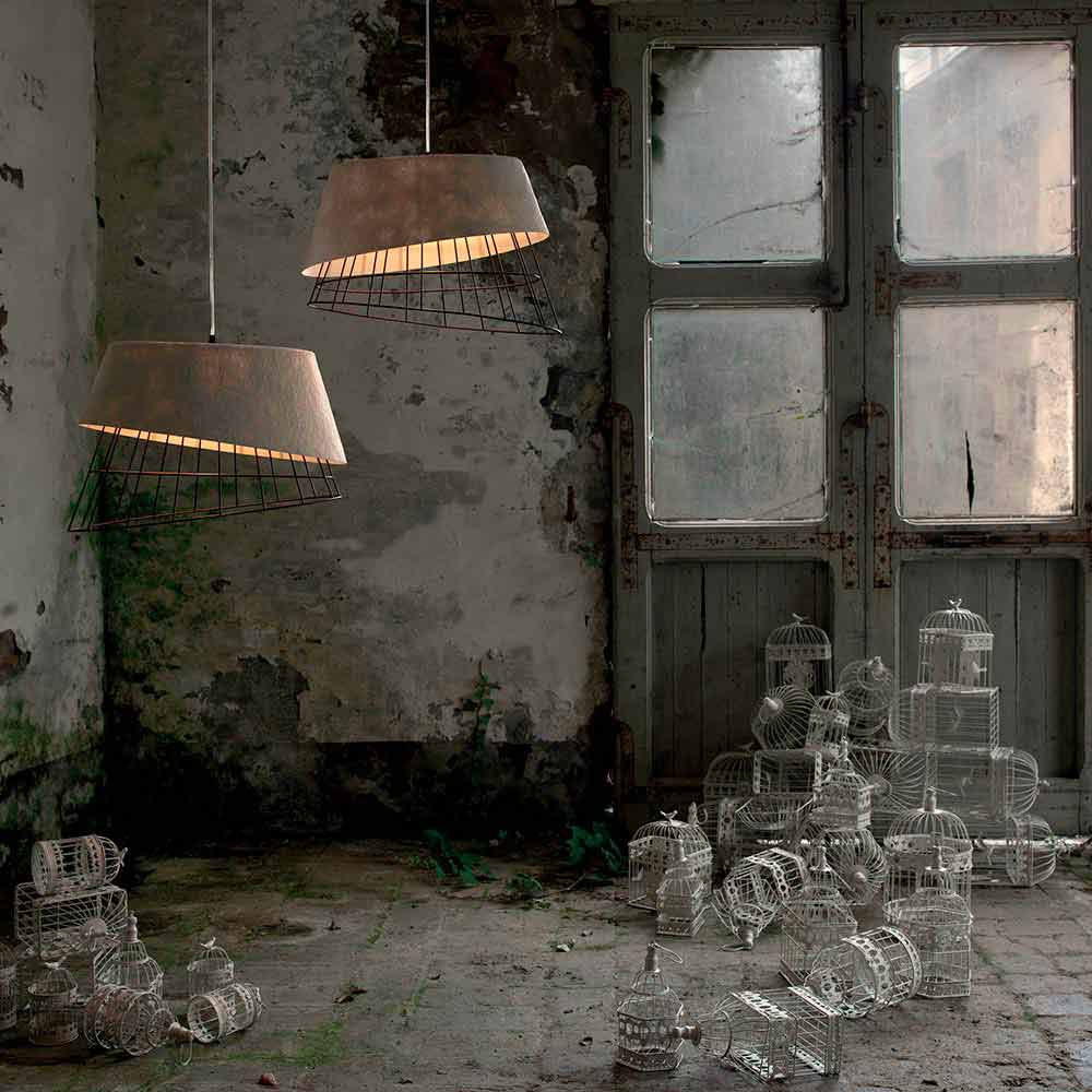 Denna originella och enstaka upphängningslampa har en industriell design men mycket elegant och modern tack vare glasfiberlampskärmen och det sneda snittet som kännetecknar den.