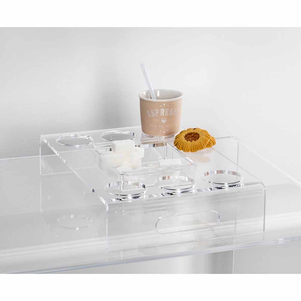 2 genomskinliga plexiglasbrickor för kaffe för 6 eller 8 glas, tillverkade i italiensk design.