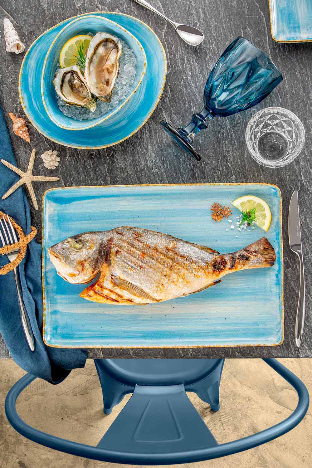 - anisblå : havets färg och havsbrisen som smälter in i himmelens oerhörd, för en mise en plats som vill överraska och lyfta fram smakfulla idéer i köket.