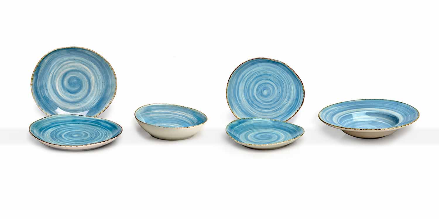 - Originalitet : de oregelbundna formerna, dekorationerna med obekanta penseldrag och med en fläckig effekt färdig och målad för hand och den föråldrade kanten, belyser kollektionens rustika och jordnära stil . Varje skillnad mellan ett stycke och ett annat ska betraktas som ett ytterligare kännetecken på värde och personlighet, vilket gör varje bit unik.