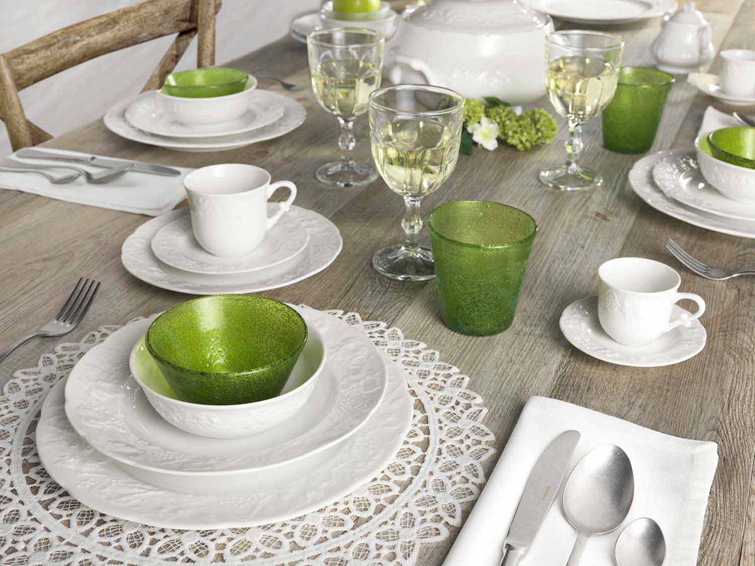 skulpturell elegans i lättnad är nycklarna för dessa skapelser i ljust vitt porslin och en konstnärlig lättnadsdekoration. Å ena sidan en attraktiv design med flera former, å andra sidan den charmiga landinspirerade dekorationen.