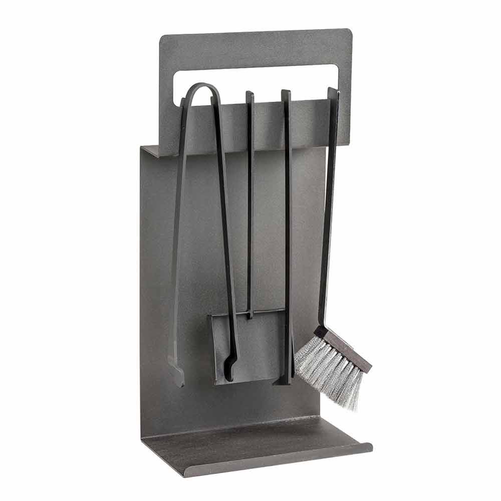 verktygshållare för öppen spis är ett oumbärligt komplement för att placeras bredvid vedhållaren eftersom den är utrustad med fyra olika typer av verktyg som är användbara för att underhålla elden och rengöra eldstaden.
