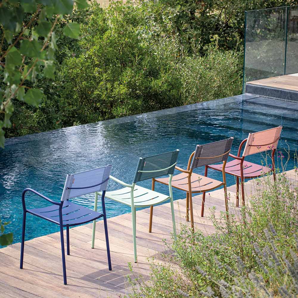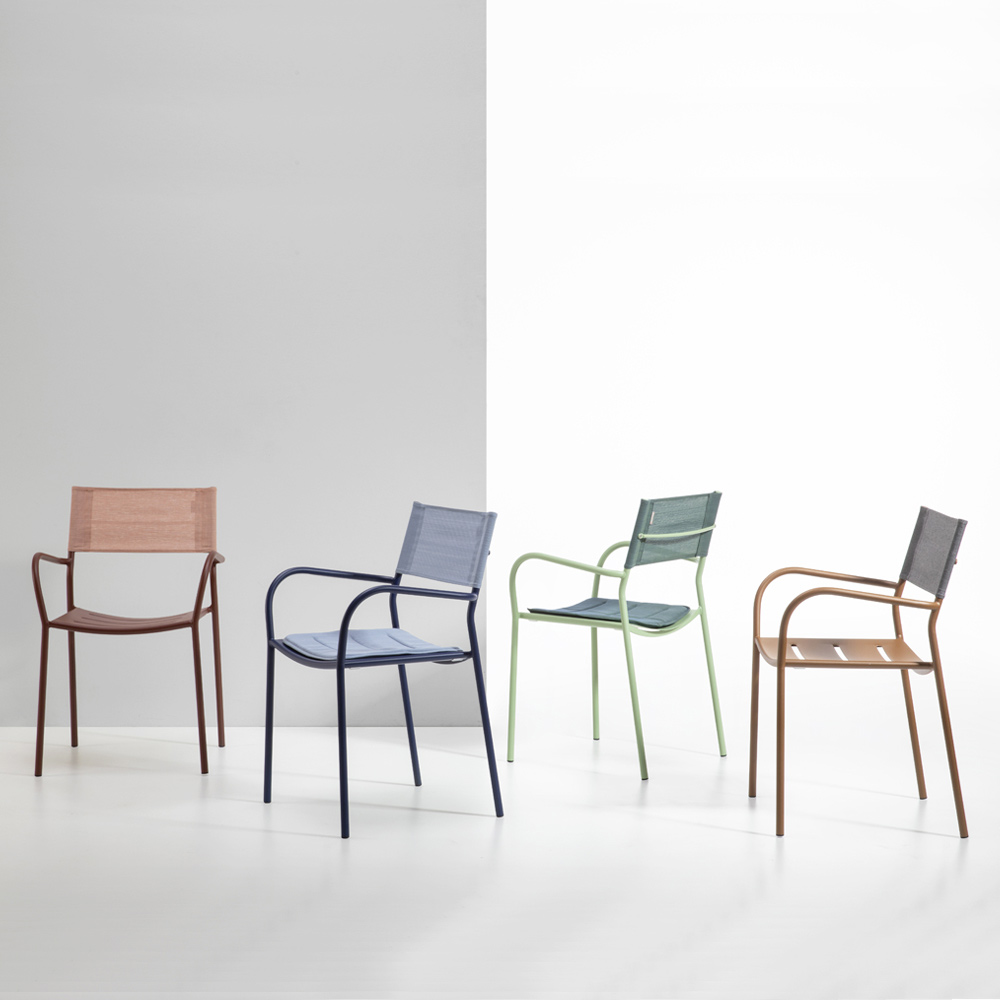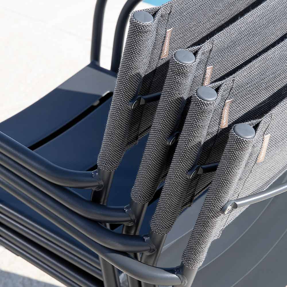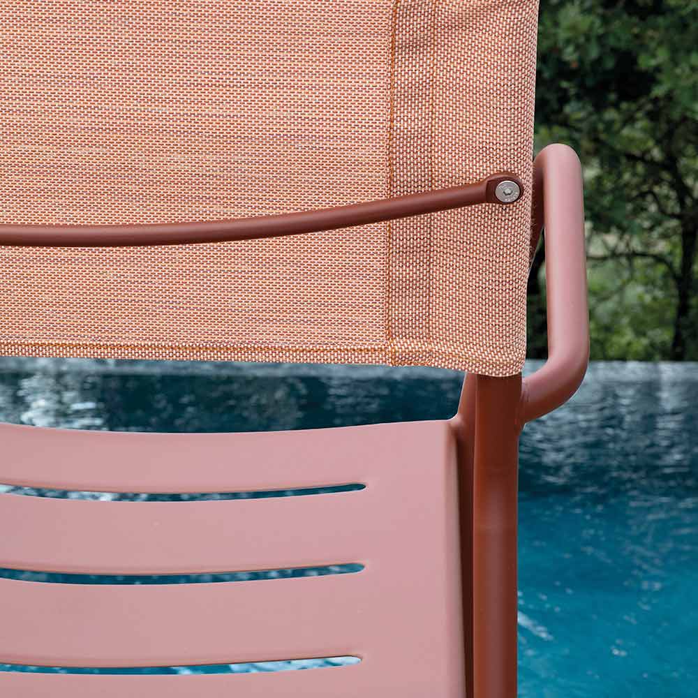 Den ergonomiska sitsen med slingrande linjer garanterar utmärkt stöd och komfort, medan det andningsbara batyline-ryggstödet erbjuder överlägsen komfort, anpassar sig perfekt till kroppens form och främjar luftcirkulationen även under de varmaste dagarna. De rundade armstöden ger en touch av elegans och gör stolen ännu bekvämare för trevliga stunder av avkoppling utomhus.