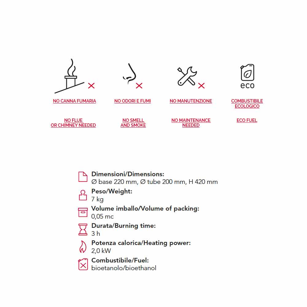 Kännetecknad av en struktur i pulverlackerad stålplåt, komplett med en manuell cirkulär brännare Griff 8 varade i 3 timmar och kalorieffekten 2,0 kW.
