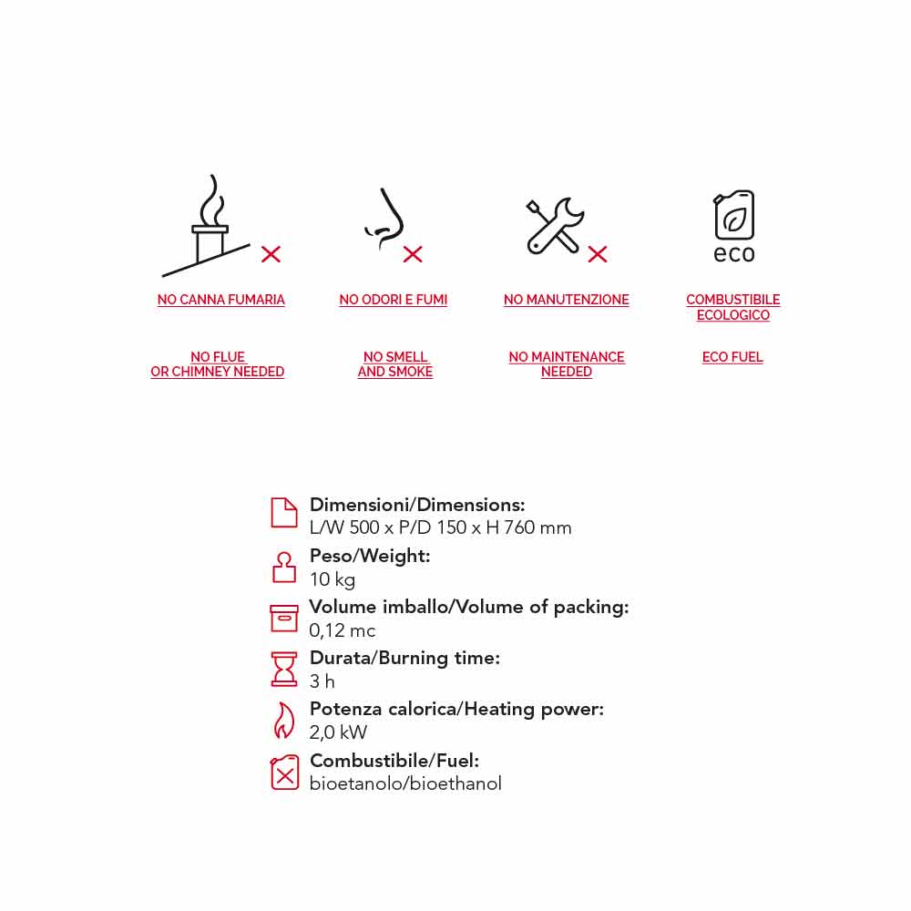 Den huvudsakliga egenheten med denna eldstad ligger i dess egenskap av att inte producera ångor och ångor , förutom att den inte kräver en rökkanal . Ekologisk eldstad som inte behöver underhållas , eftersom den drivs av bioetanol, en förnybar energikälla.