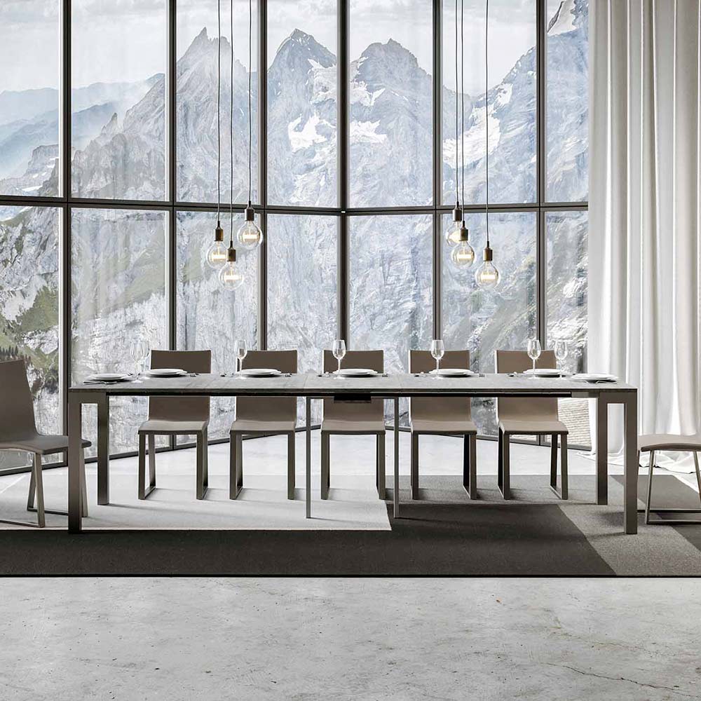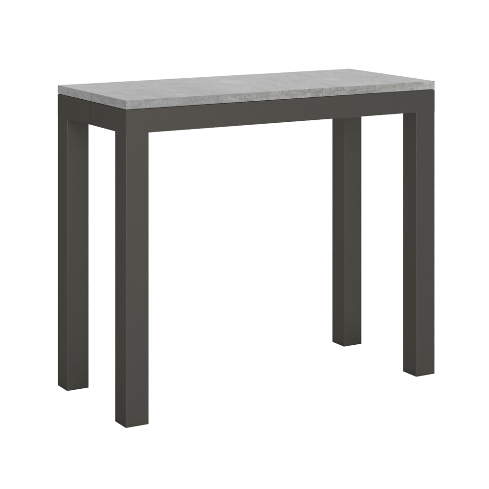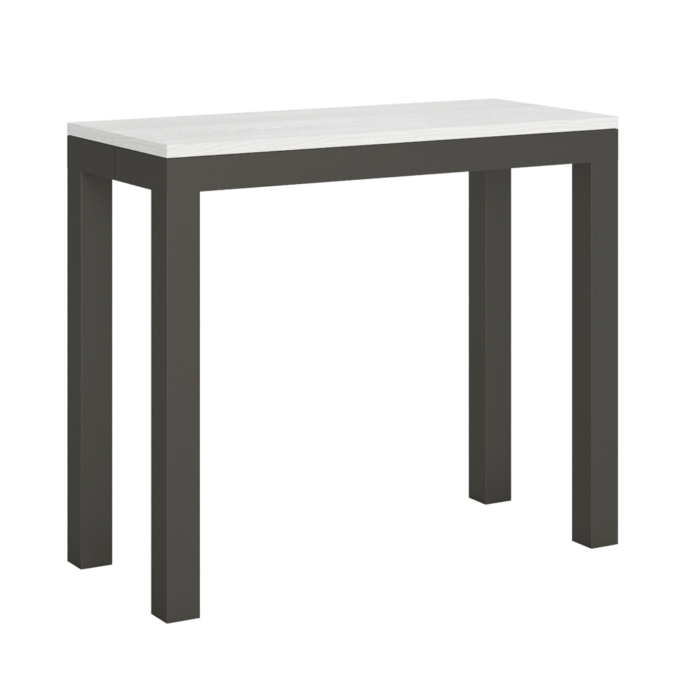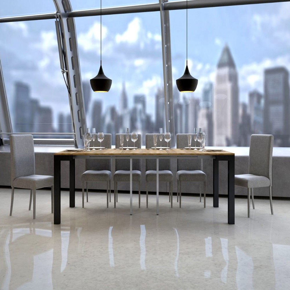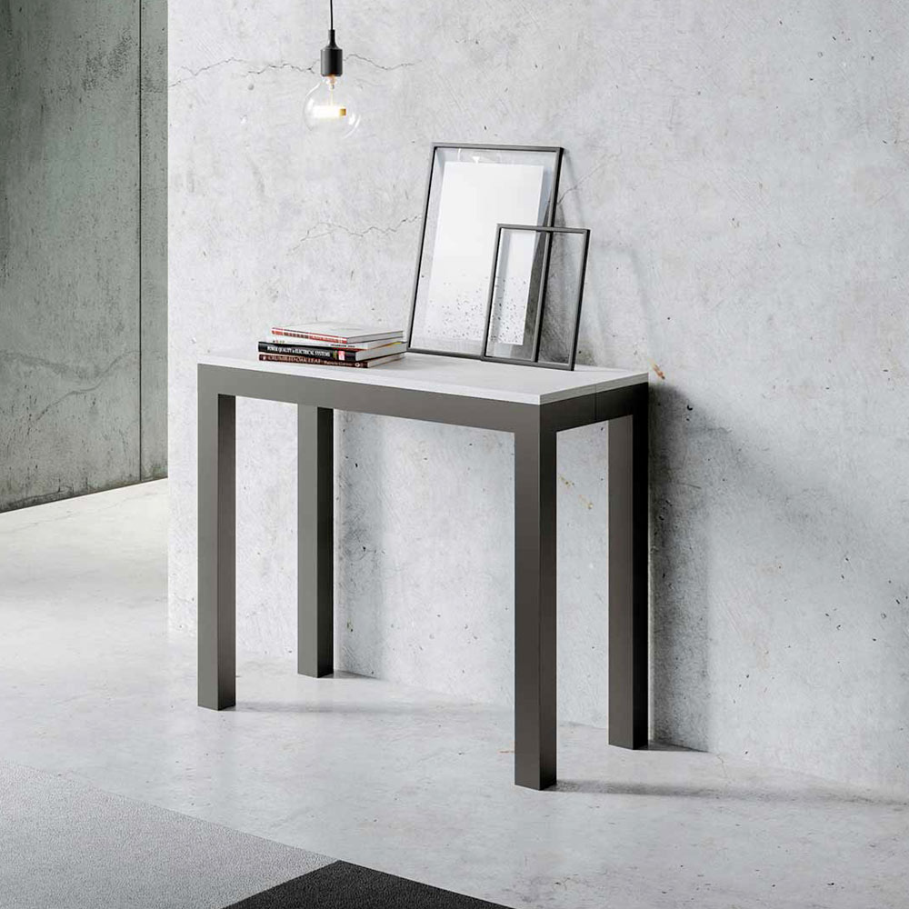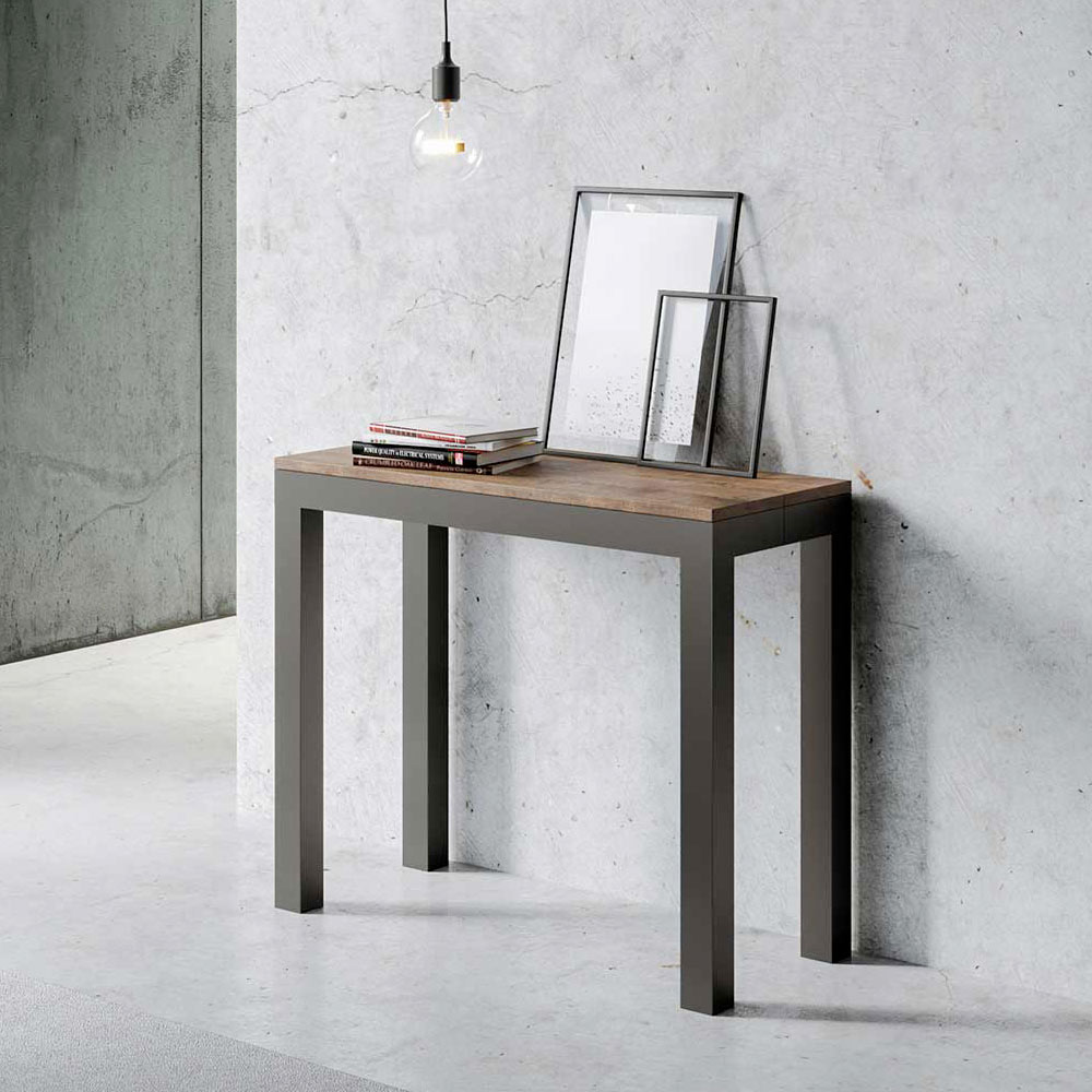 Det här utdragbara konsolbordet kombinerar ren modern design med maximal rumslig effektivitet. Den breda, solida ramen av laserskuret järn med hög precision utgör den bärande strukturen, och en järnram stöder en raffinerad träskiva som harmoniskt sträcker sig och avslöjar möjligheten till dubbel användning: elegant och diskret när den är stängd, rymlig och välkomnande när den är öppen.