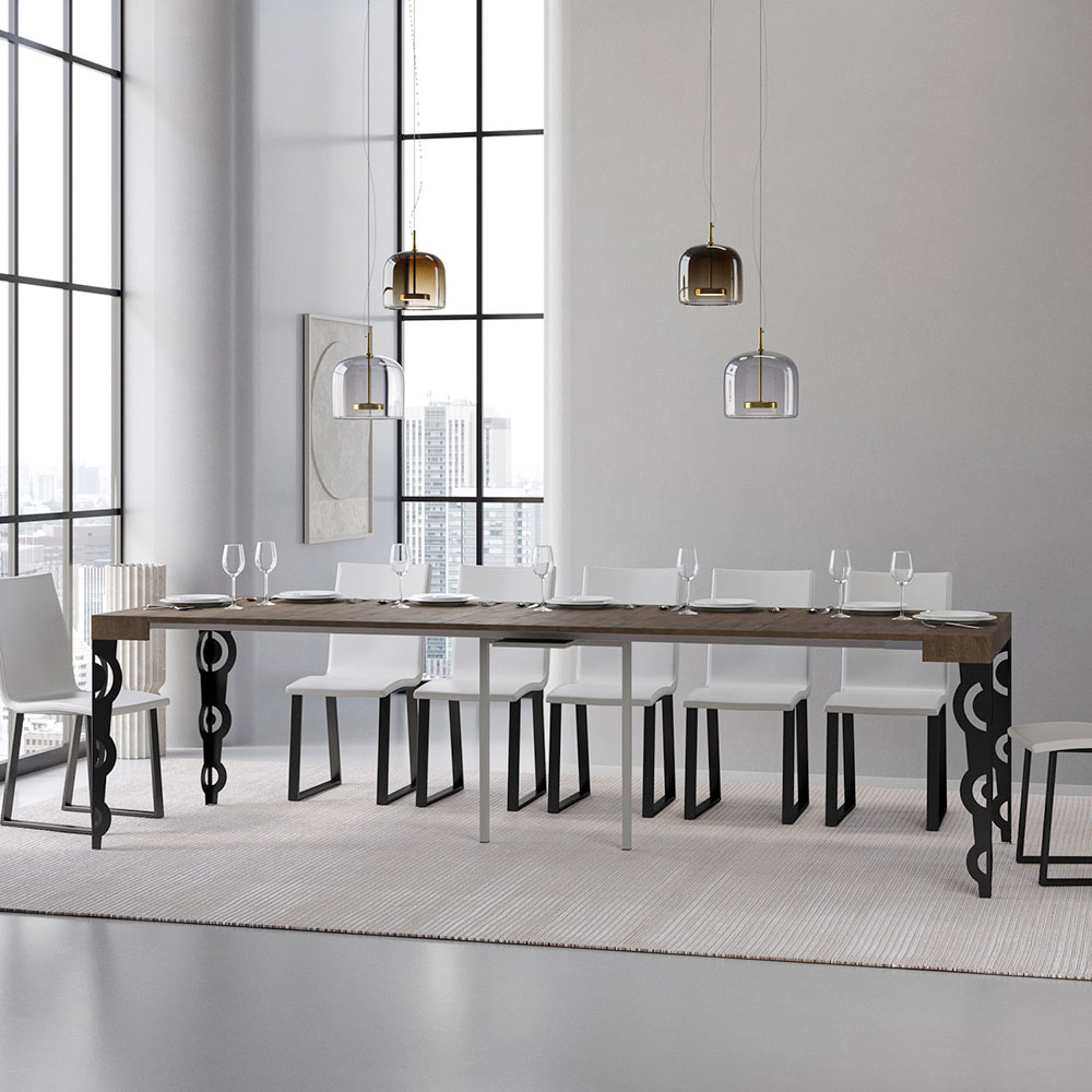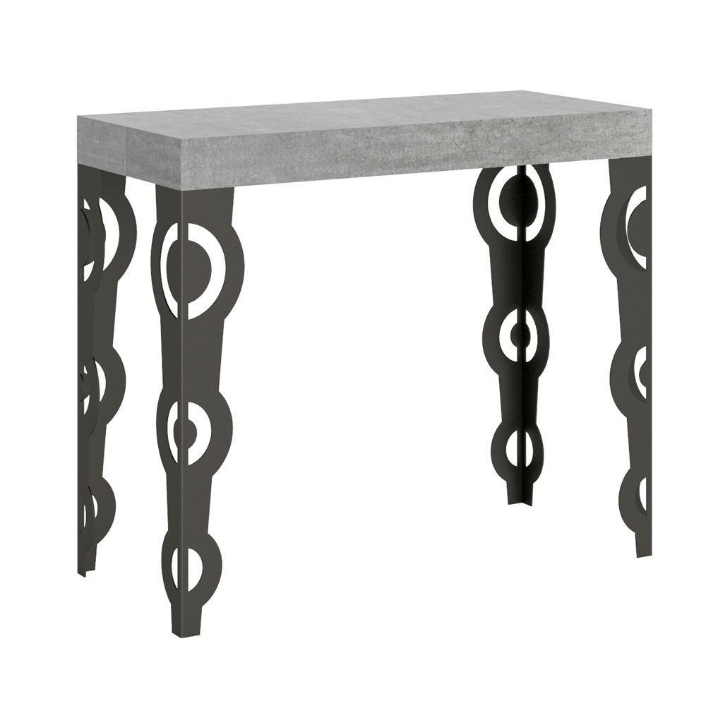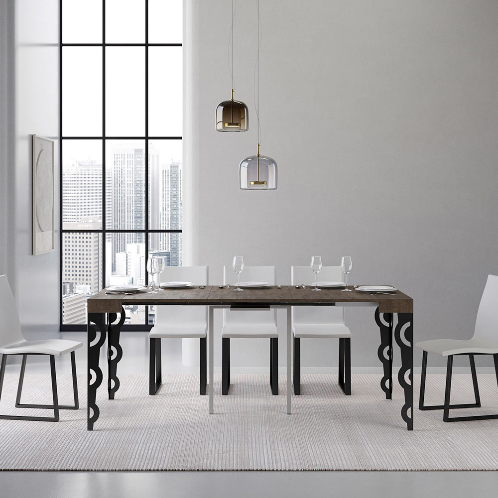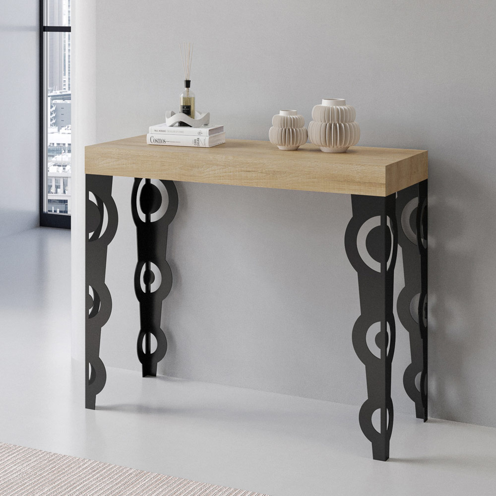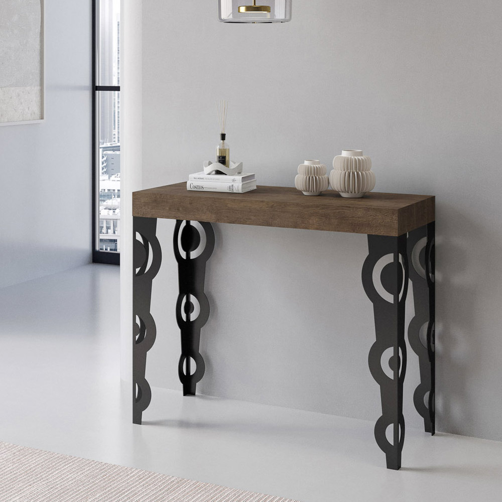 Detta förlängningsbara konsolbord är ett djärvt uttalande om stil och design. Dess topp ger det en urban och modern känsla, medan de skulpterade benen har ett intrikat mönster som påminner om Art Decò konstverk, vilket ger pjäsen en distinkt personlighet och visuell attraktionskraft.