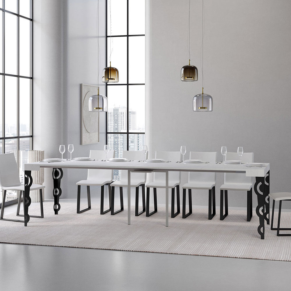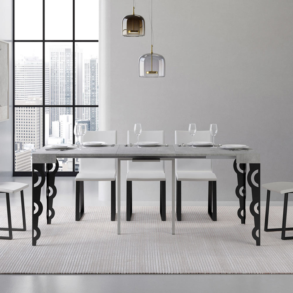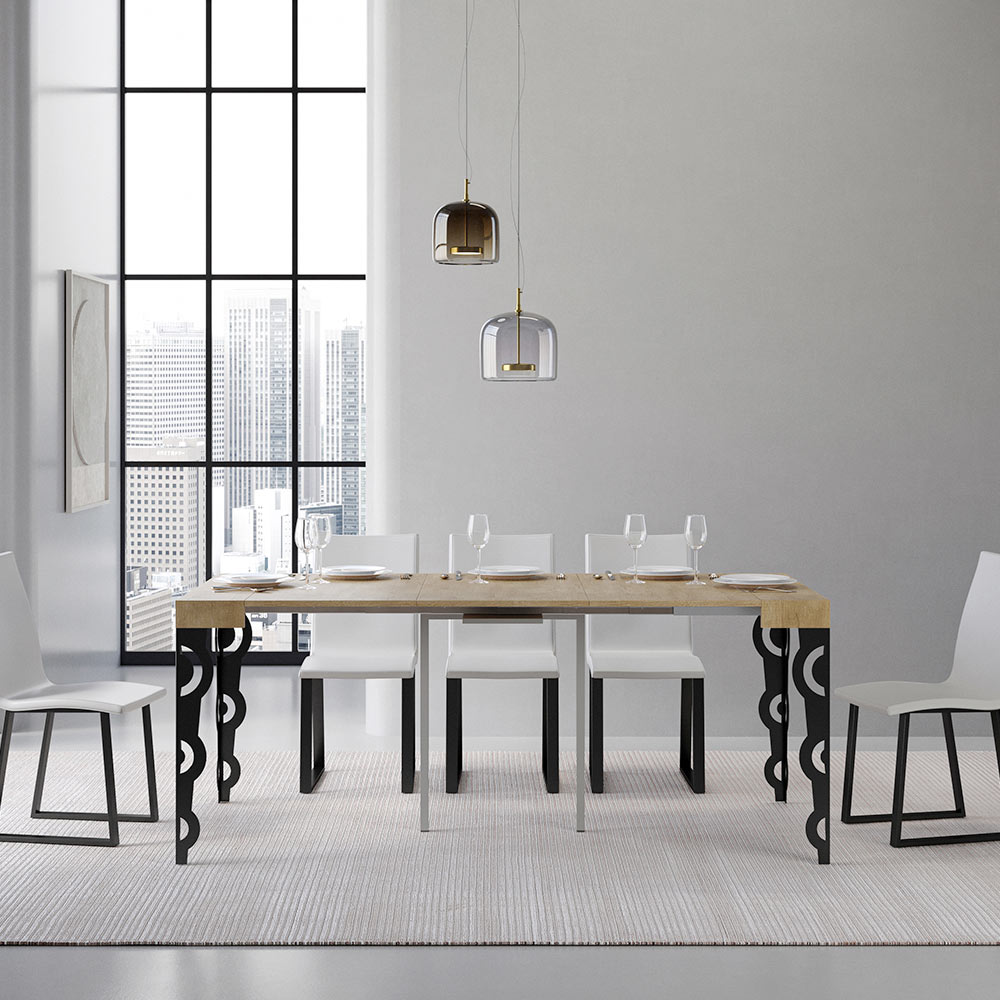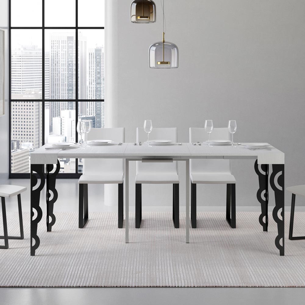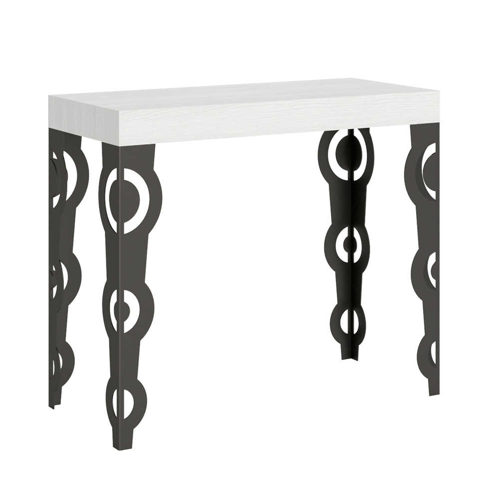 Detta förlängningsbara konsolbord är ett djärvt uttalande om stil och design. Dess topp ger det en urban och modern känsla, medan de skulpterade benen har ett intrikat mönster som påminner om Art Decò konstverk, vilket ger pjäsen en distinkt personlighet och visuell attraktionskraft.