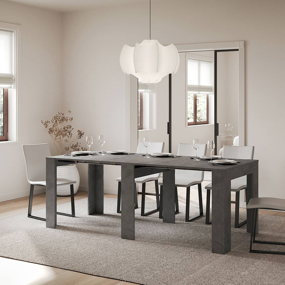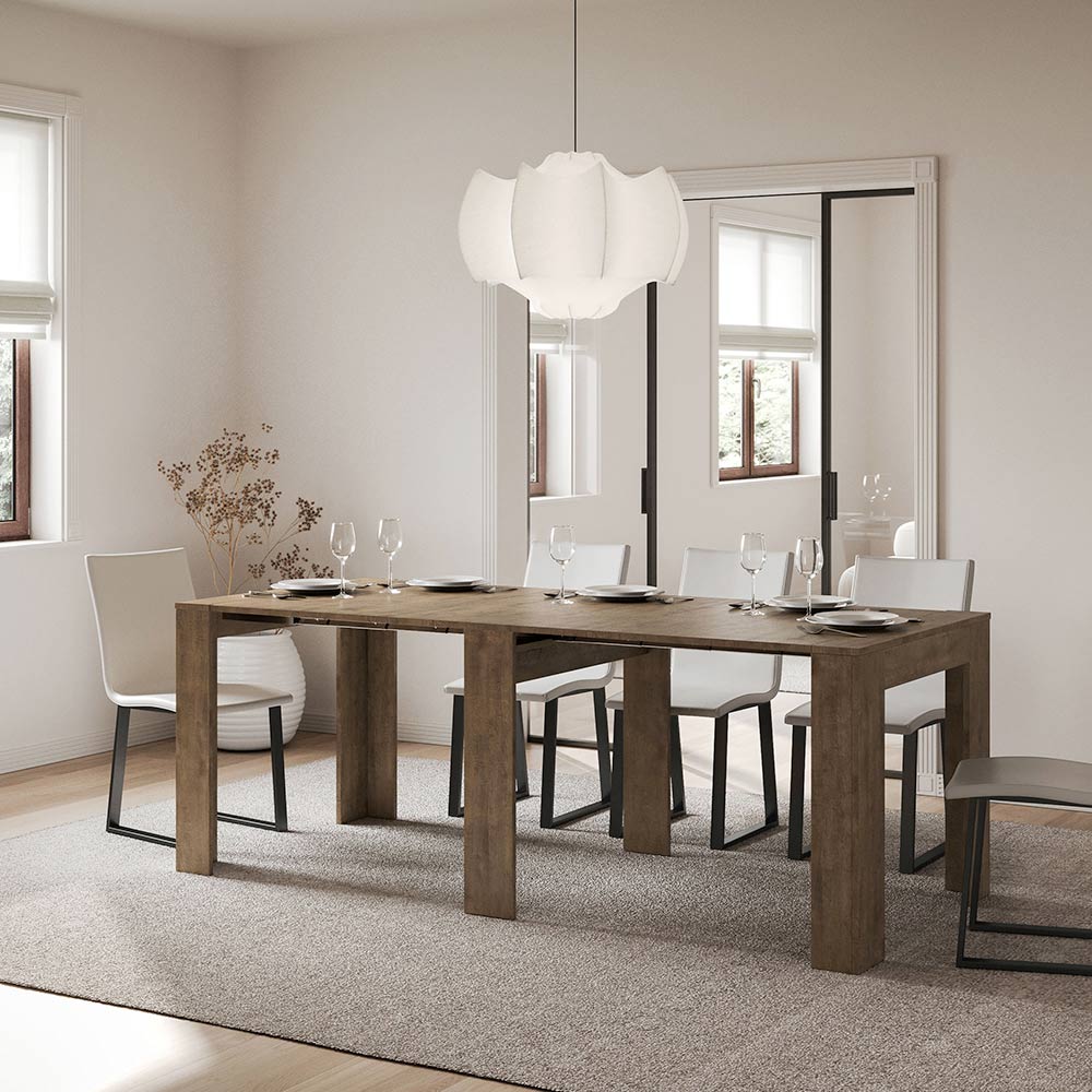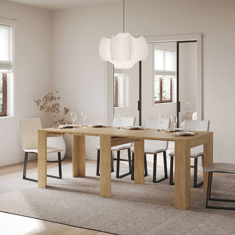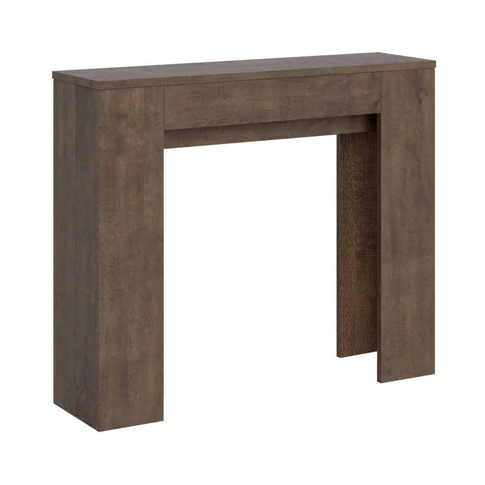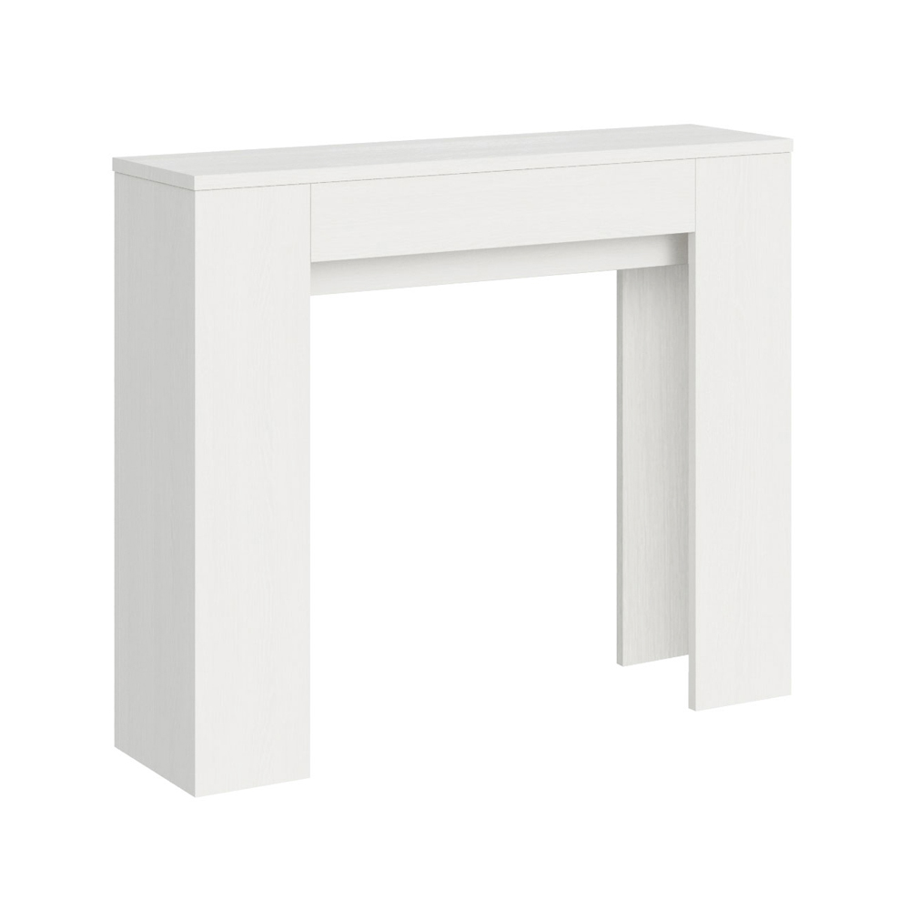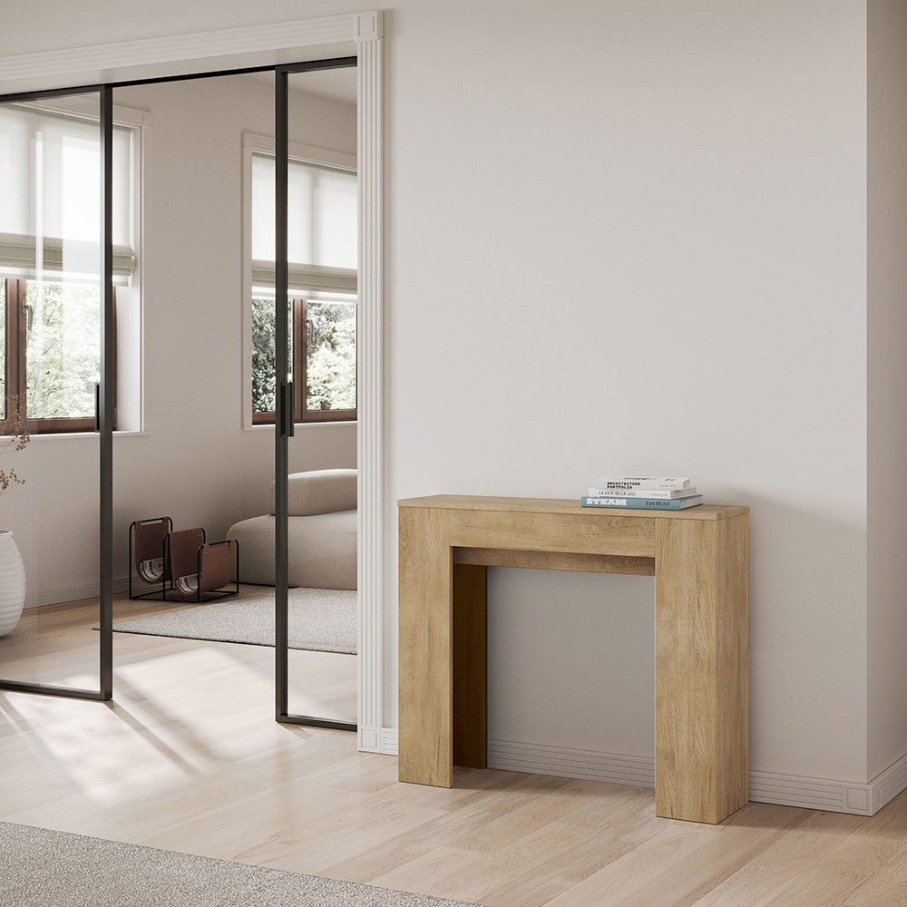 Detta utdragbara konsolbord är symbolen för funktionell och minimalistisk design. Dess eleganta form och rena linjer gör det till en mångsidig möbel, perfekt för alla utrymmen från entrén till vardagsrummet, och ger en bild av rymd och ordning. Konsolbordet kan enkelt byggas ut och förvandlas från en diskret möbel till ett praktiskt matbord, perfekt för att bjuda in vänner och familj vid speciella tillfällen. Denna mångsidighet gör det till ett perfekt val för dem som bor i små utrymmen men inte vill offra funktionalitet och stil.