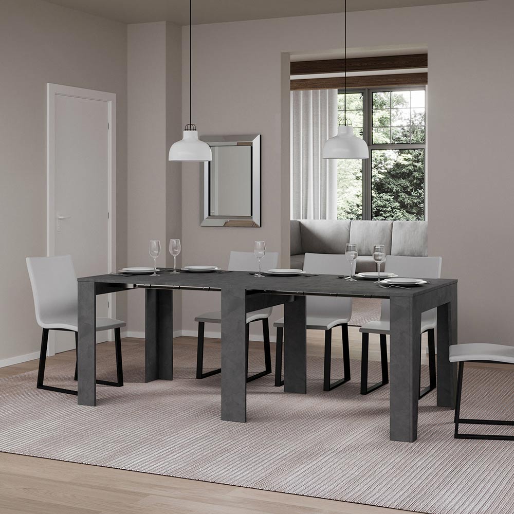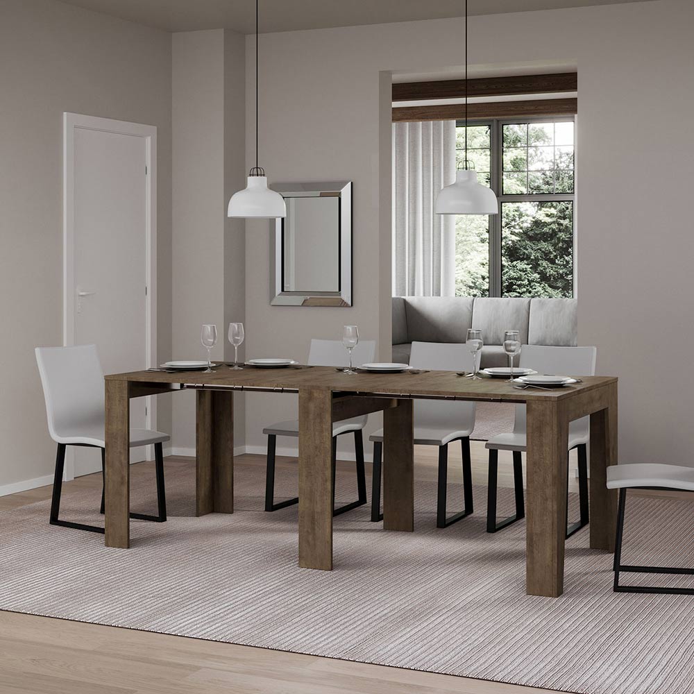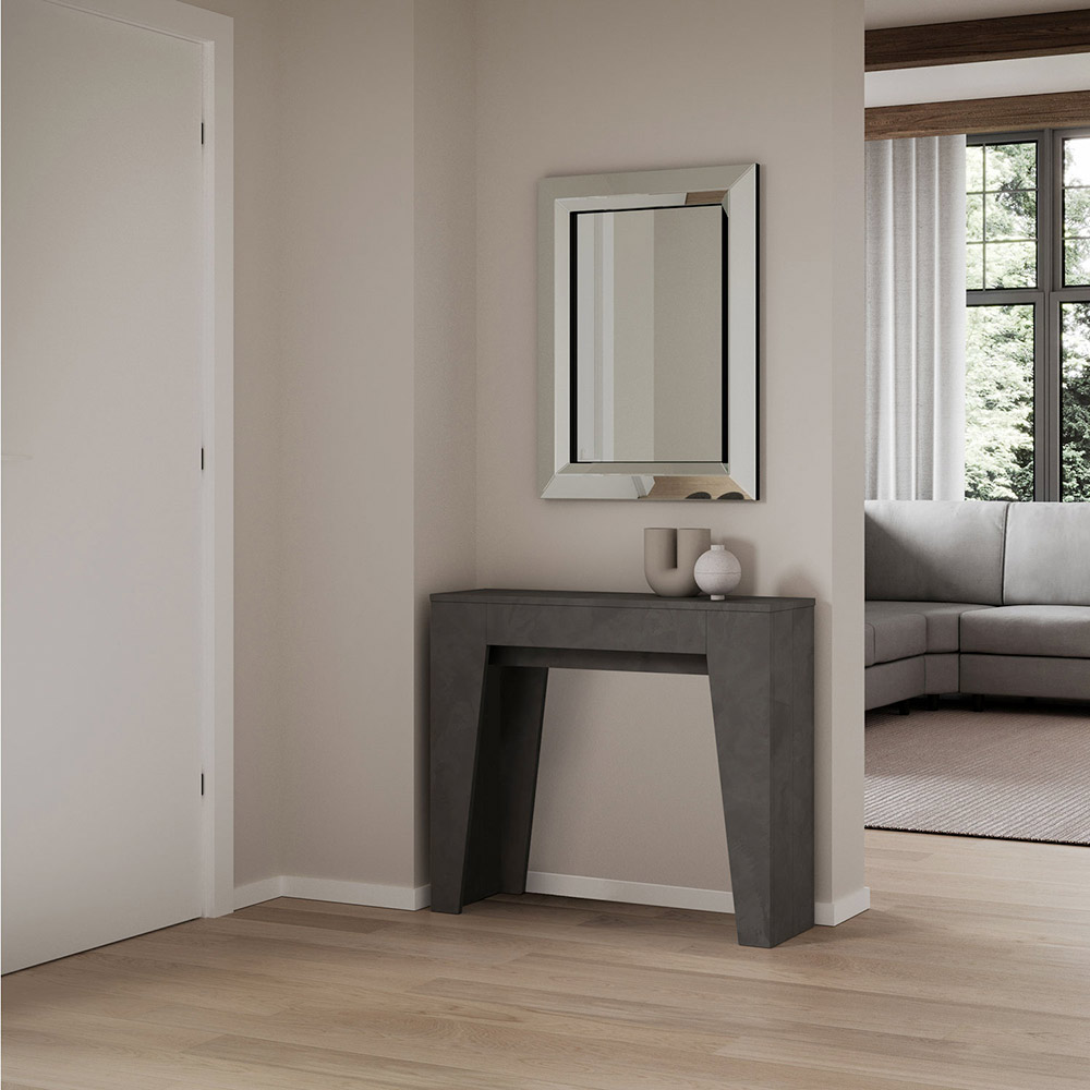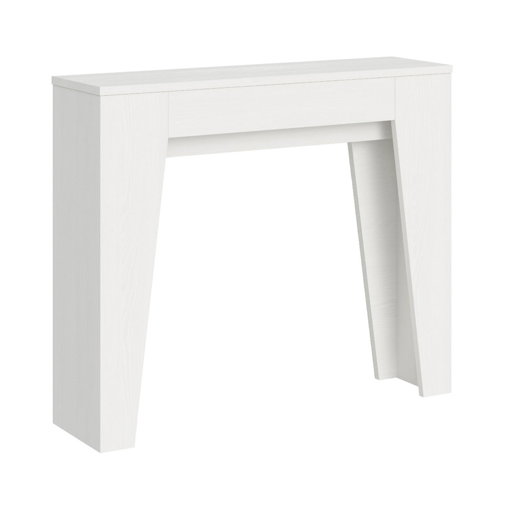 Detta utdragbara konsolbord är symbolen för funktionell och minimalistisk design. Dess eleganta form och rena linjer gör det till en mångsidig möbel, perfekt för alla utrymmen från entrén till vardagsrummet, och ger en bild av rymd och ordning. Konsolbordet kan enkelt byggas ut och förvandlas från en diskret möbel till ett praktiskt matbord, perfekt för att bjuda in vänner och familj vid speciella tillfällen. Denna mångsidighet gör det till ett perfekt val för dem som bor i små utrymmen men inte vill offra funktionalitet och stil.