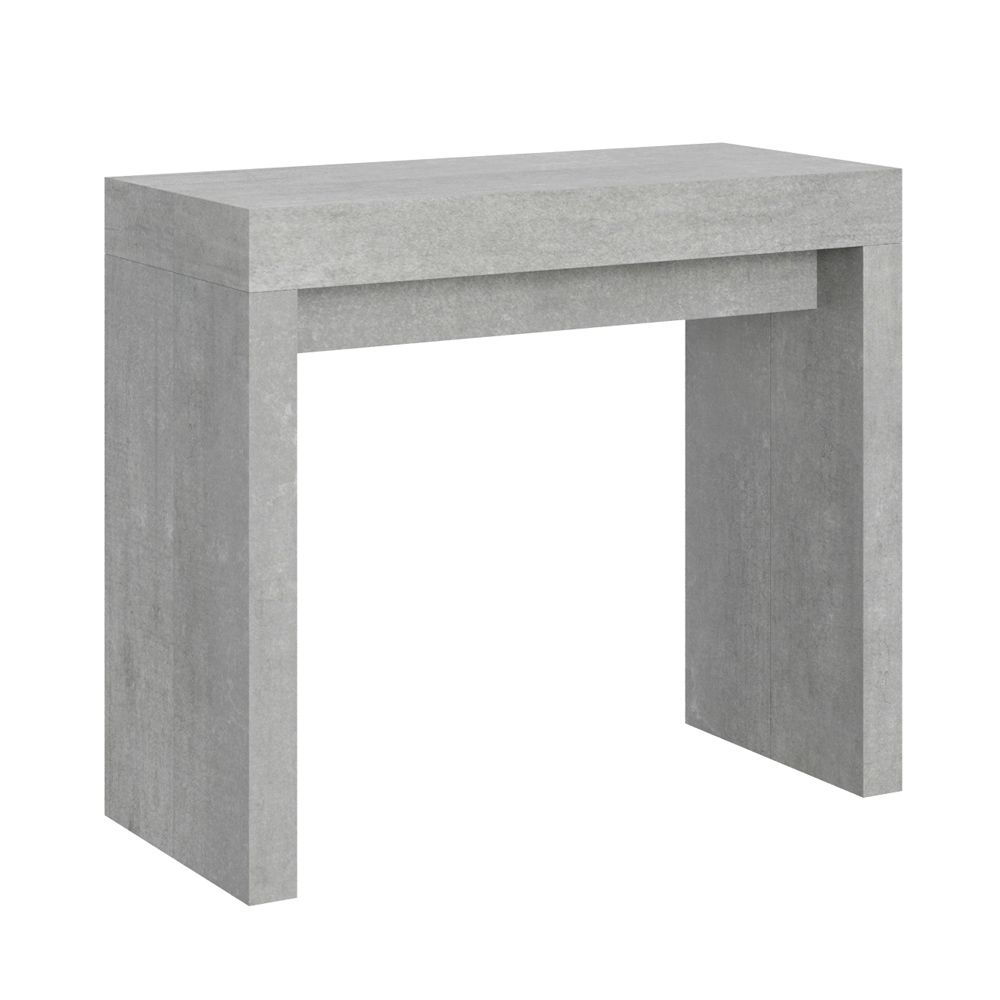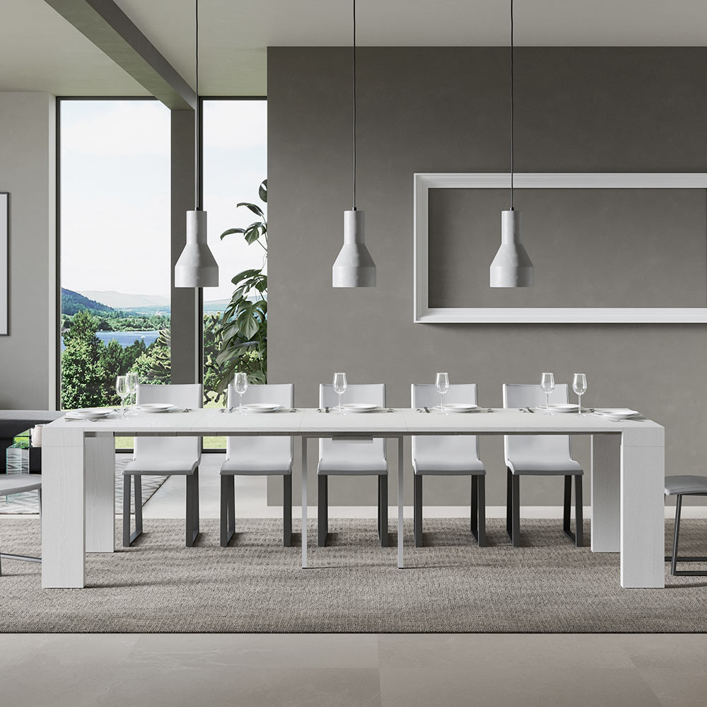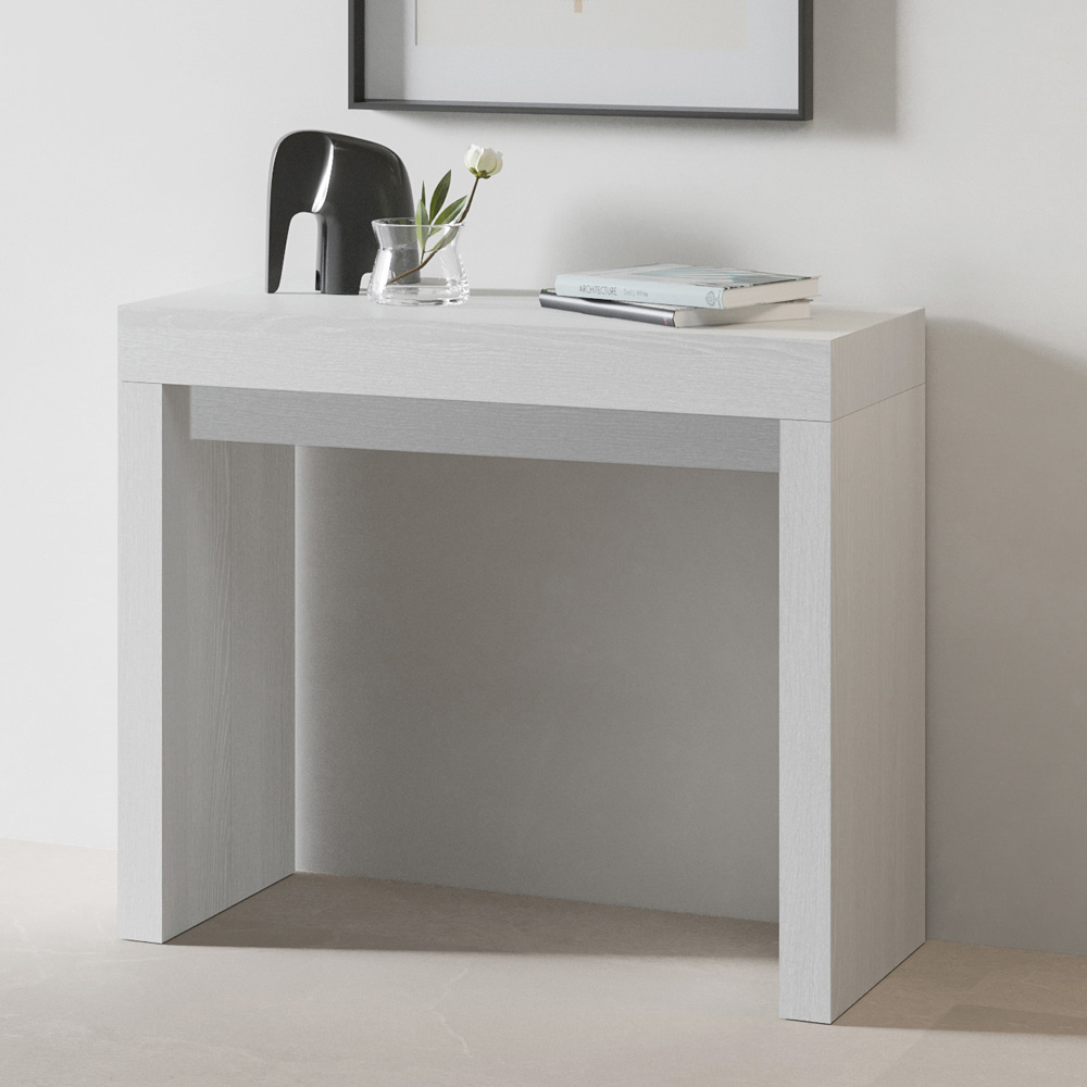 Detta utdragbara konsolbord är ett mästerverk av samtida design och intuitiv funktionalitet. Toppskivan och sidorna i möblerat trä ger en ljus och öppen känsla, perfekt för dig som vill skapa ett utrymme som är både luftigt och modernt. Dess essentiella och rena estetik gör den lämplig för alla miljöer, perfekt för att passa in i en minimalistisk design eller som en kontrast i en mer färgglad och livfull.