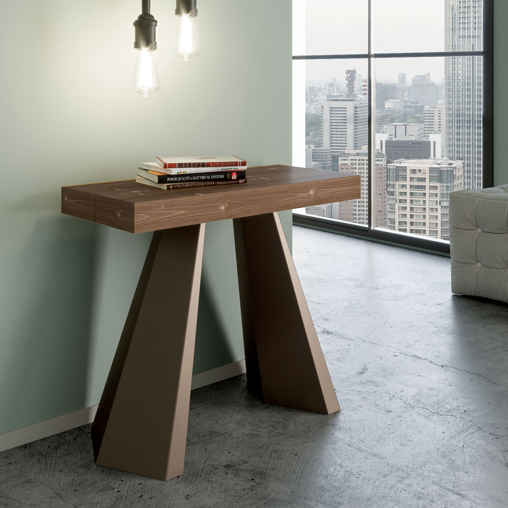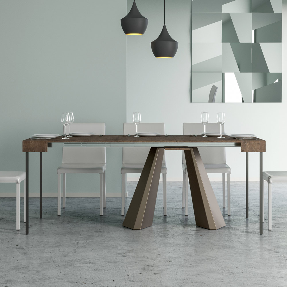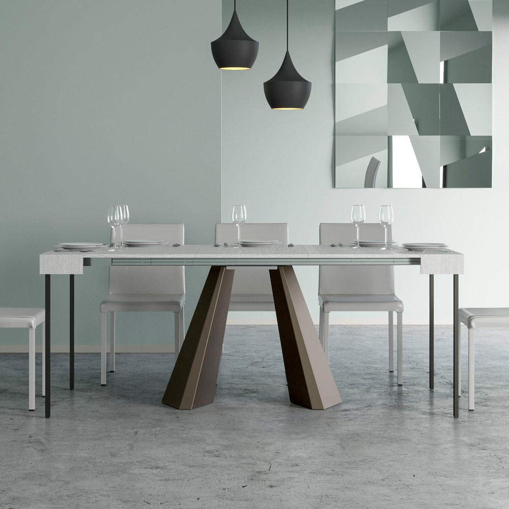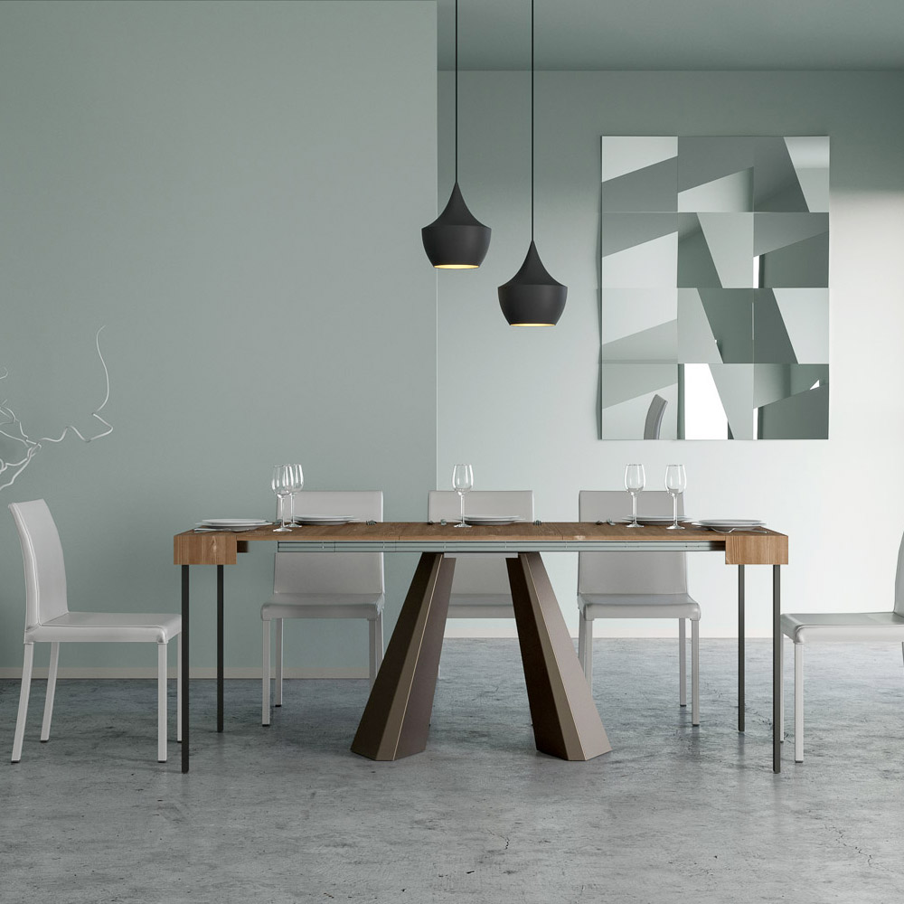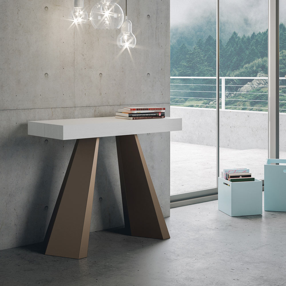 Det unika med detta konsolbord ligger i dess ben, som påminner om de geometriska formerna i modern arkitektur, vilket ger ett kulturellt och avantgardistiskt utseende. Tack vare det utdragbara systemet förvandlar denna möbel alla utrymmen från enkla till extraordinära, och kan förlängas för att rymma sociala tillfällen eller för att ge den extra yta du behöver.