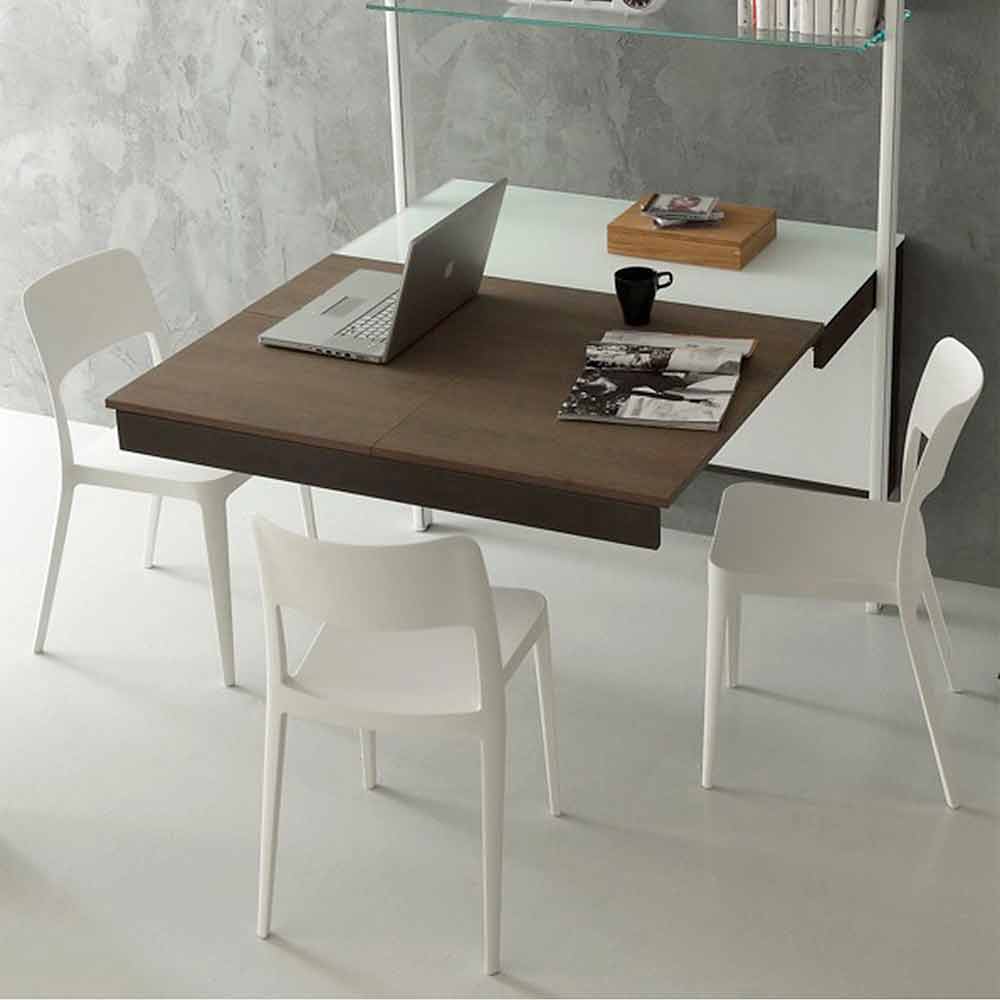 Utdragbar konsol med väggfäste tillverkad i Italien med blank vit glasskiva utrustad med kabelstyrningar och 45 cm förlängning i melamin i alm , struktur i brunmålad metall och avtagbar vertikal panel i vitt plexiglas .