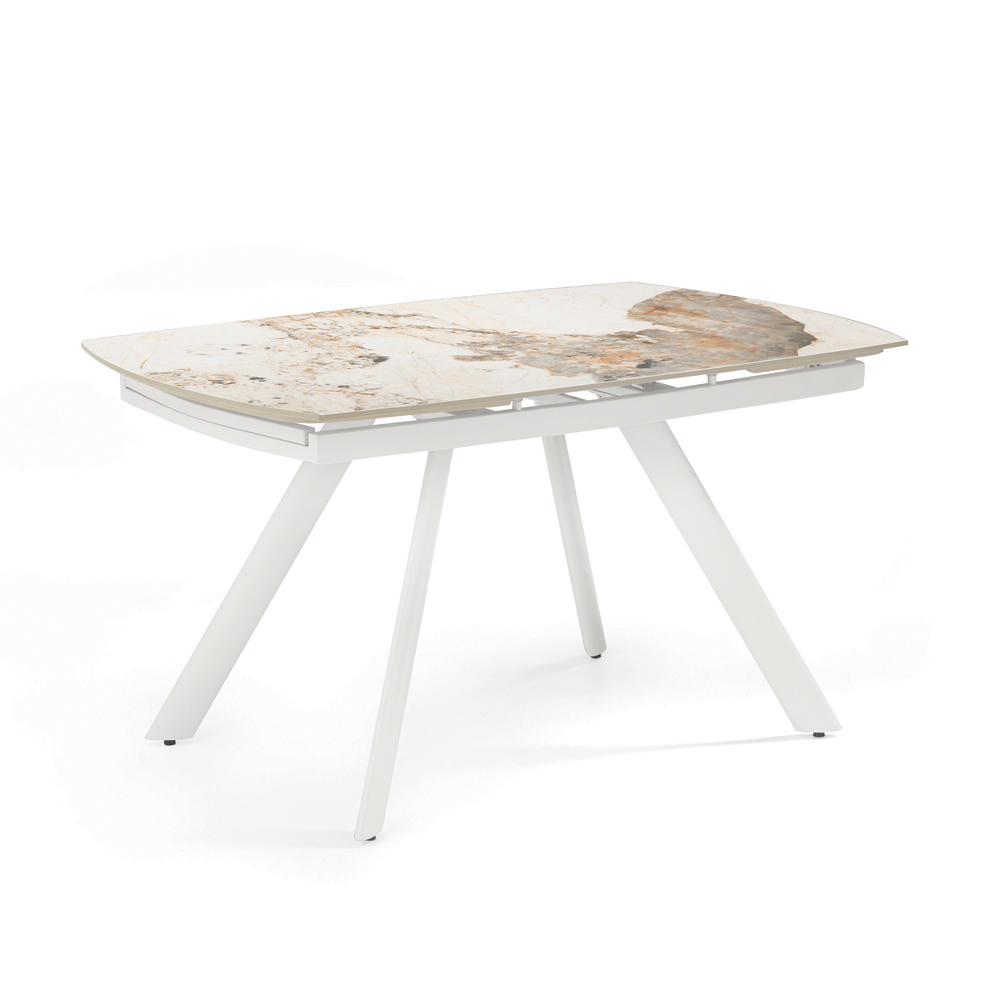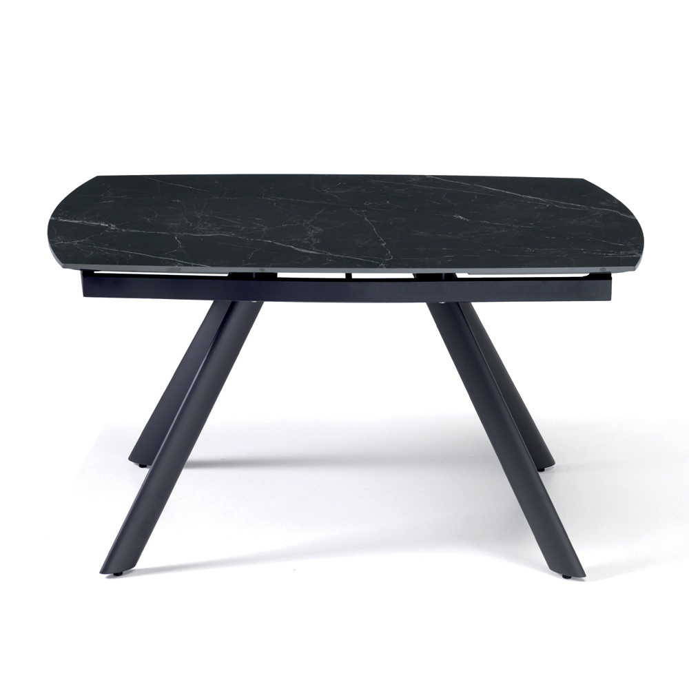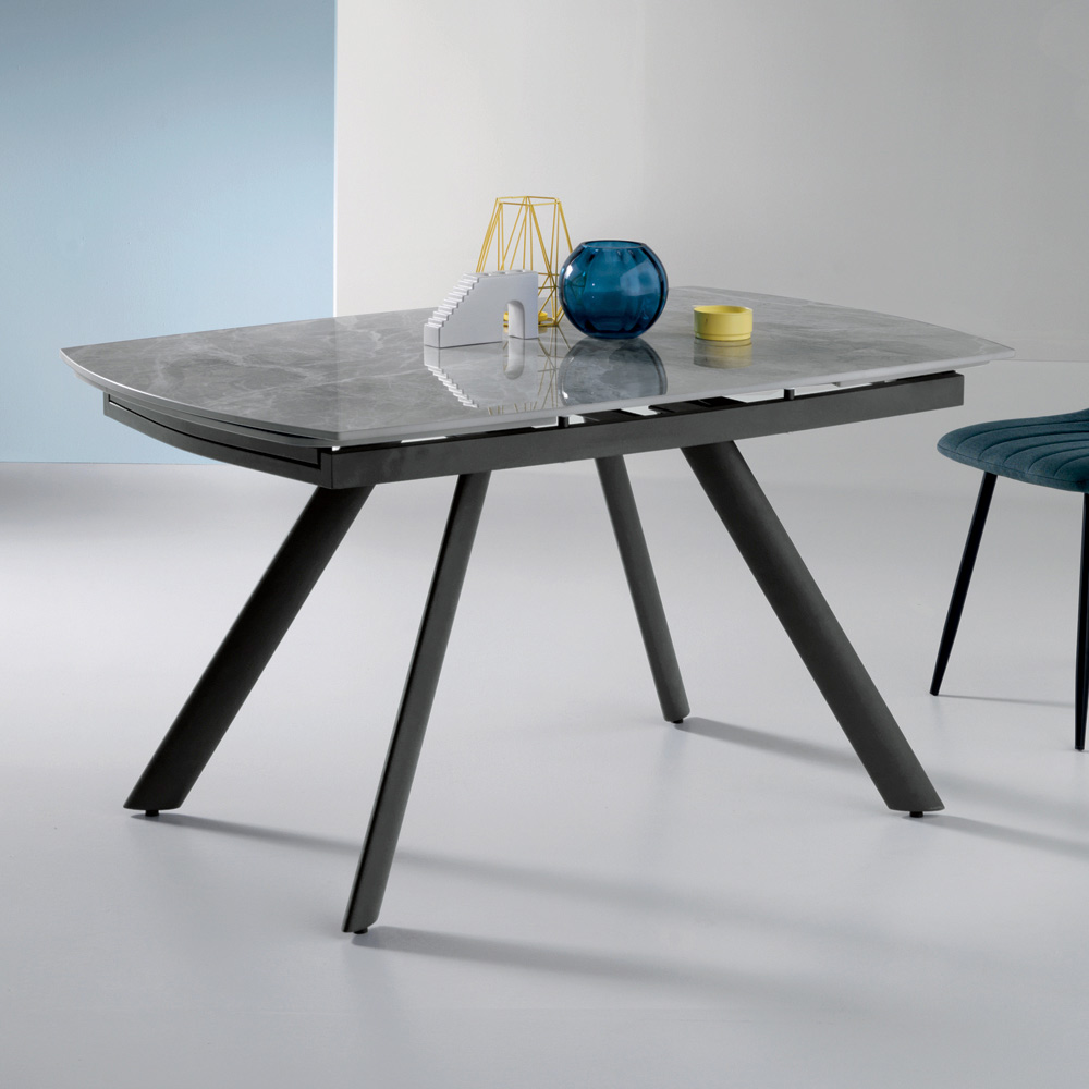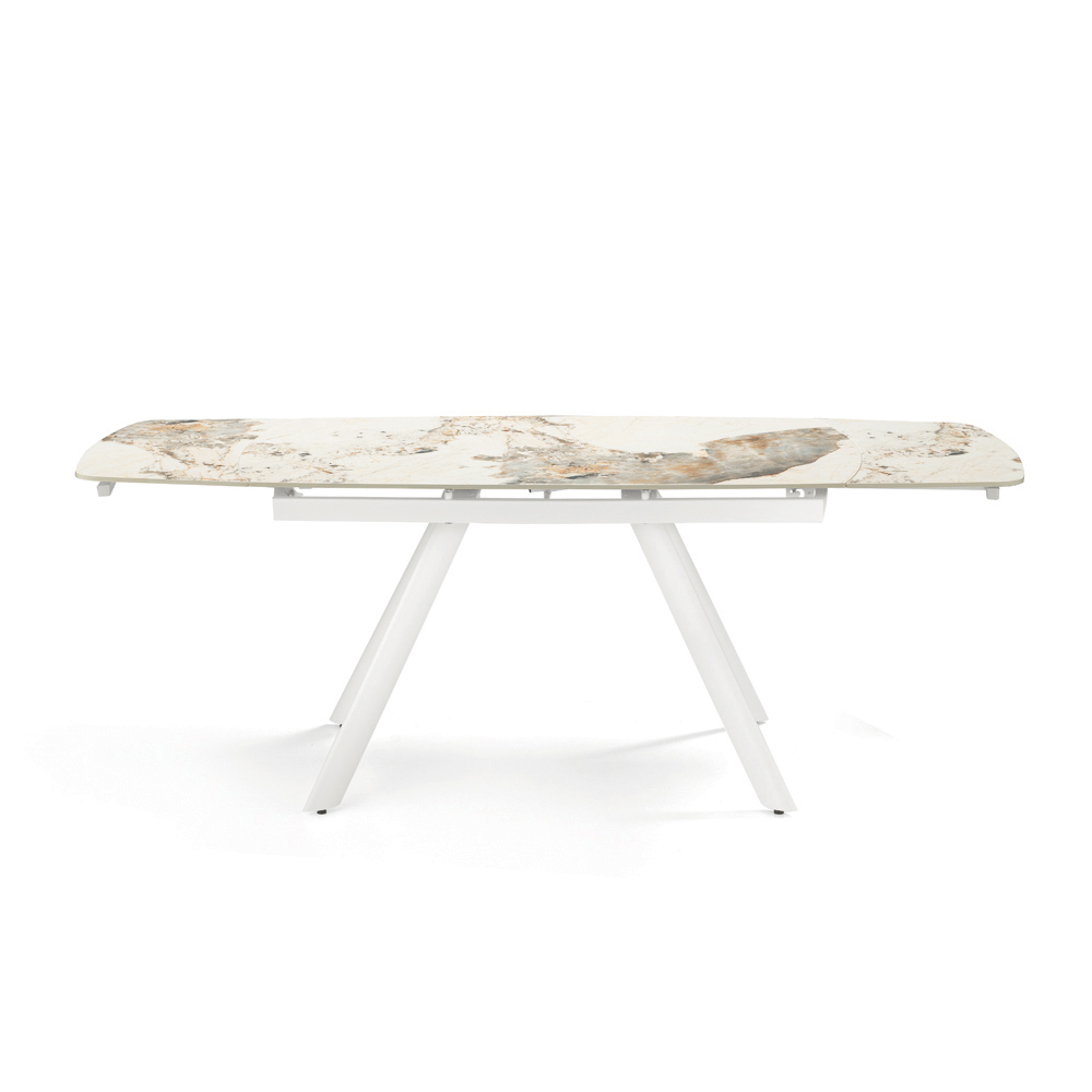 Elegant utdragbart matbord med modern design, perfekt för att elegant inreda din matsal eller vardagsrum . Den sintrade stenskivan med marmoreffekt erbjuder en raffinerad, hållbar och lättrengjord yta, perfekt för vardagsbruk. Den målade metallbasen ger stabilitet och soliditet till strukturen, vilket skapar en perfekt balans mellan modern estetik och funktionalitet.