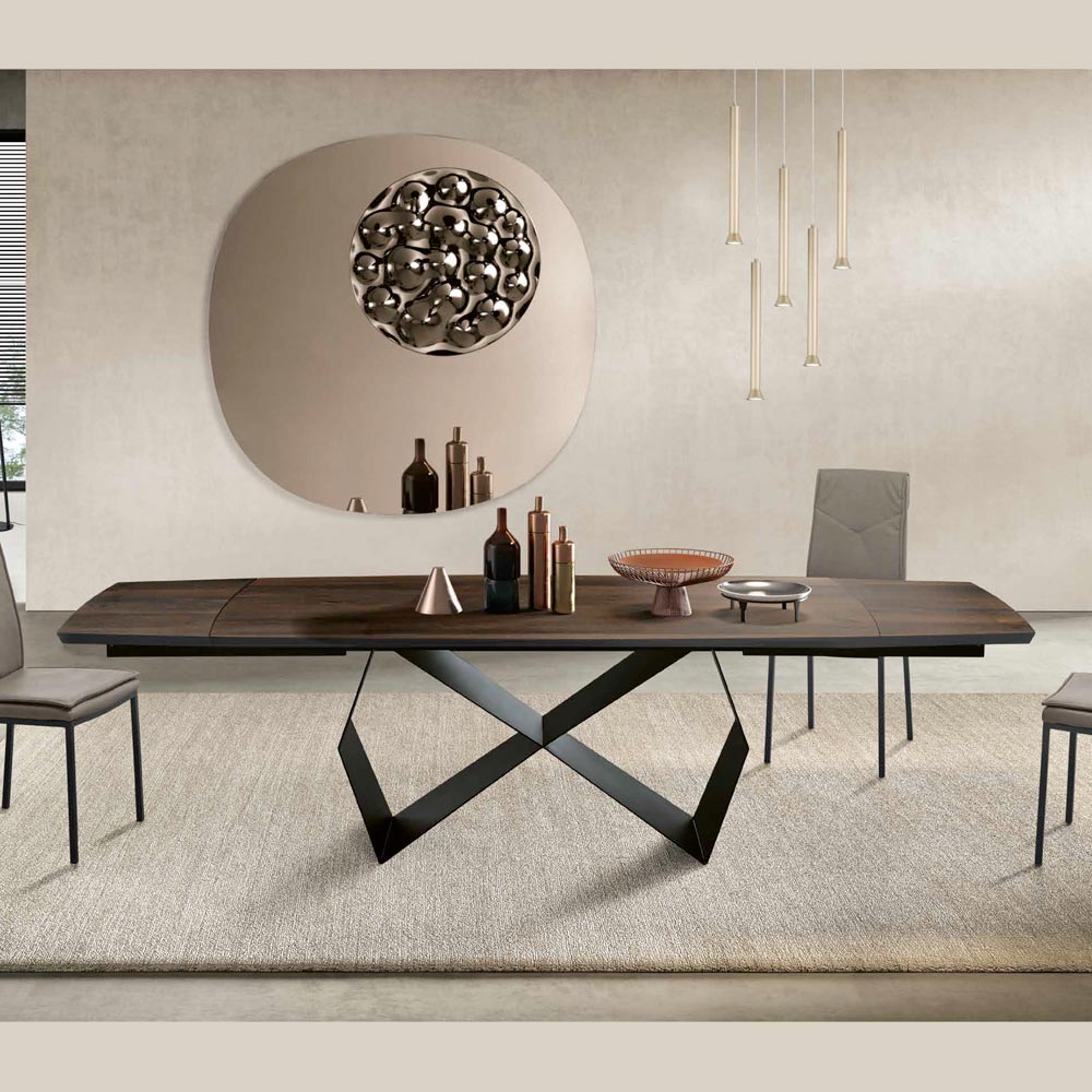 Metallbenen , som har en djärv, geometrisk form, är målade för att vackert kontrastera med trätonen. Denna kombination av material ger inte bara solid stabilitet utan lägger också till ett slagkraftigt visuellt element, vilket gör detta bord till en riktig samlingspunkt i vilken matsal eller öppen planlösning som helst.