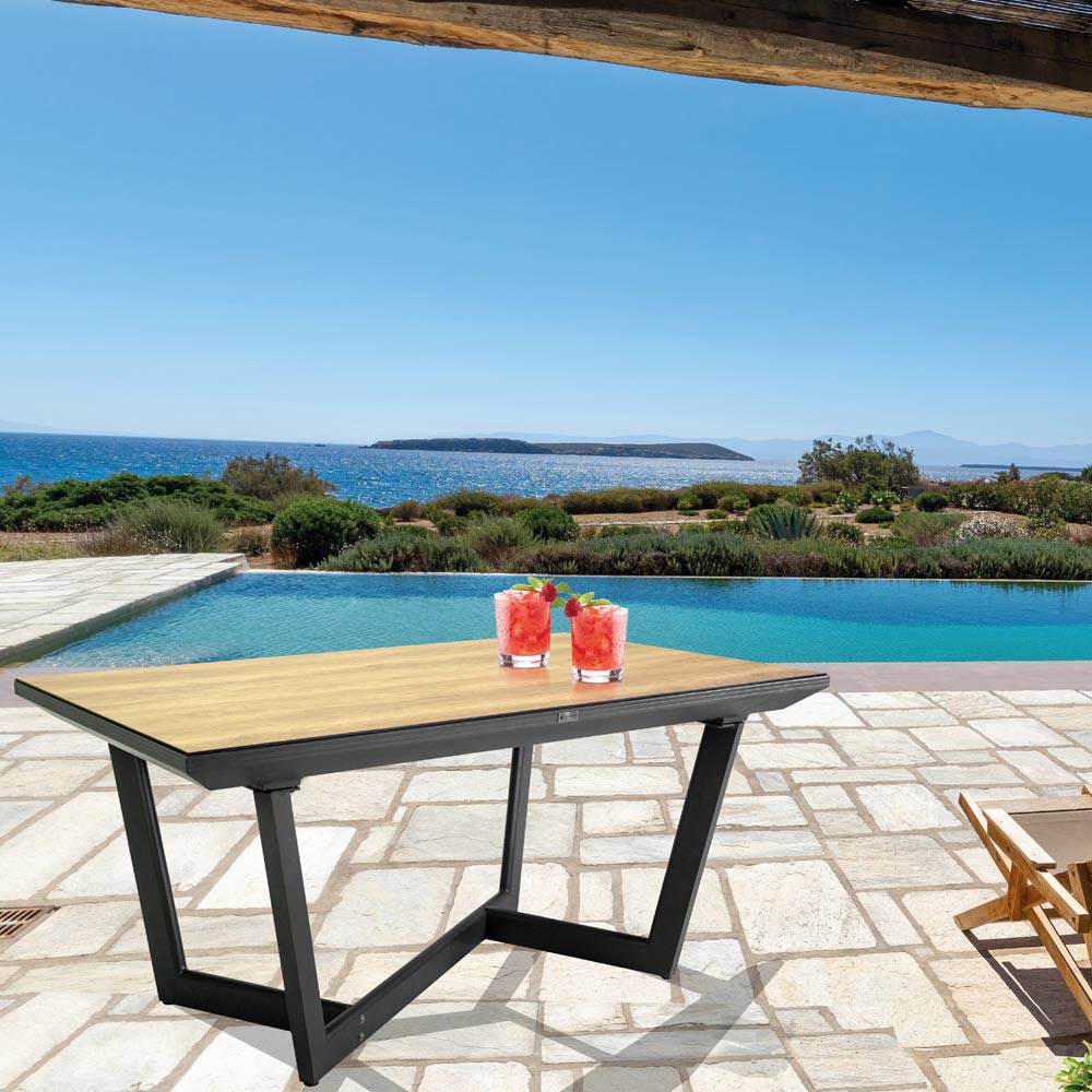 Detta bord är inte bara praktiskt med sin utdragbarhet, utan det är också estetiskt tilltalande, perfekt för alla moderna miljöer som vill kombinera funktionalitet och stil. Perfekt för uteservering, familjesammankomster eller bara för att njuta av en lugn eftermiddag i det fria, är detta bord det perfekta valet för dem som söker elegans och mångsidighet i sina trädgårdsmöbler.