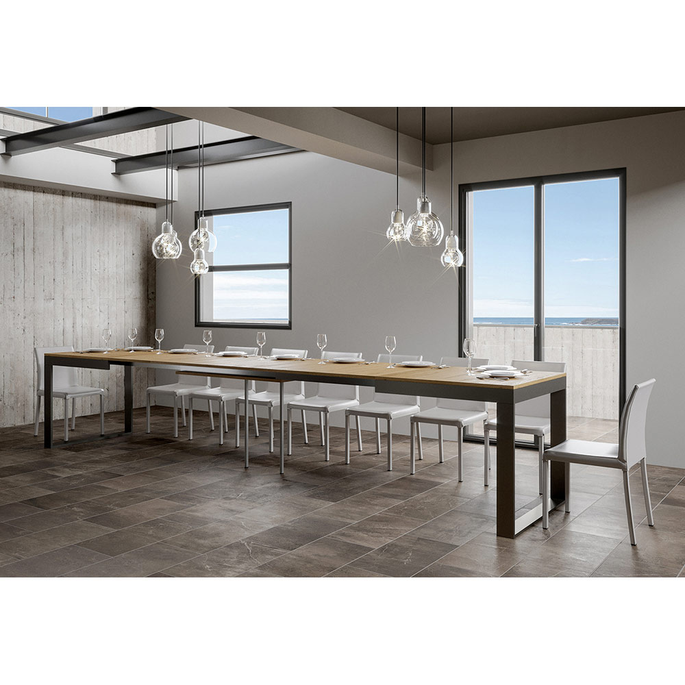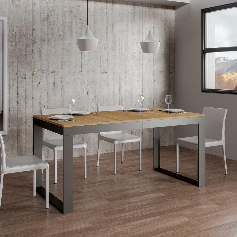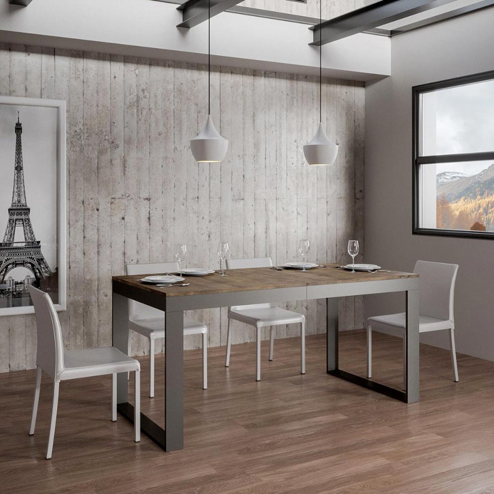 Upptäck kärnan i design med detta utdragbara bord, ett mästerverk av flexibilitet och stil. Den starka järnstrukturen passar vackert ihop med träskivan, en kombination som lovar att ge en touch av modern elegans till alla utrymmen.