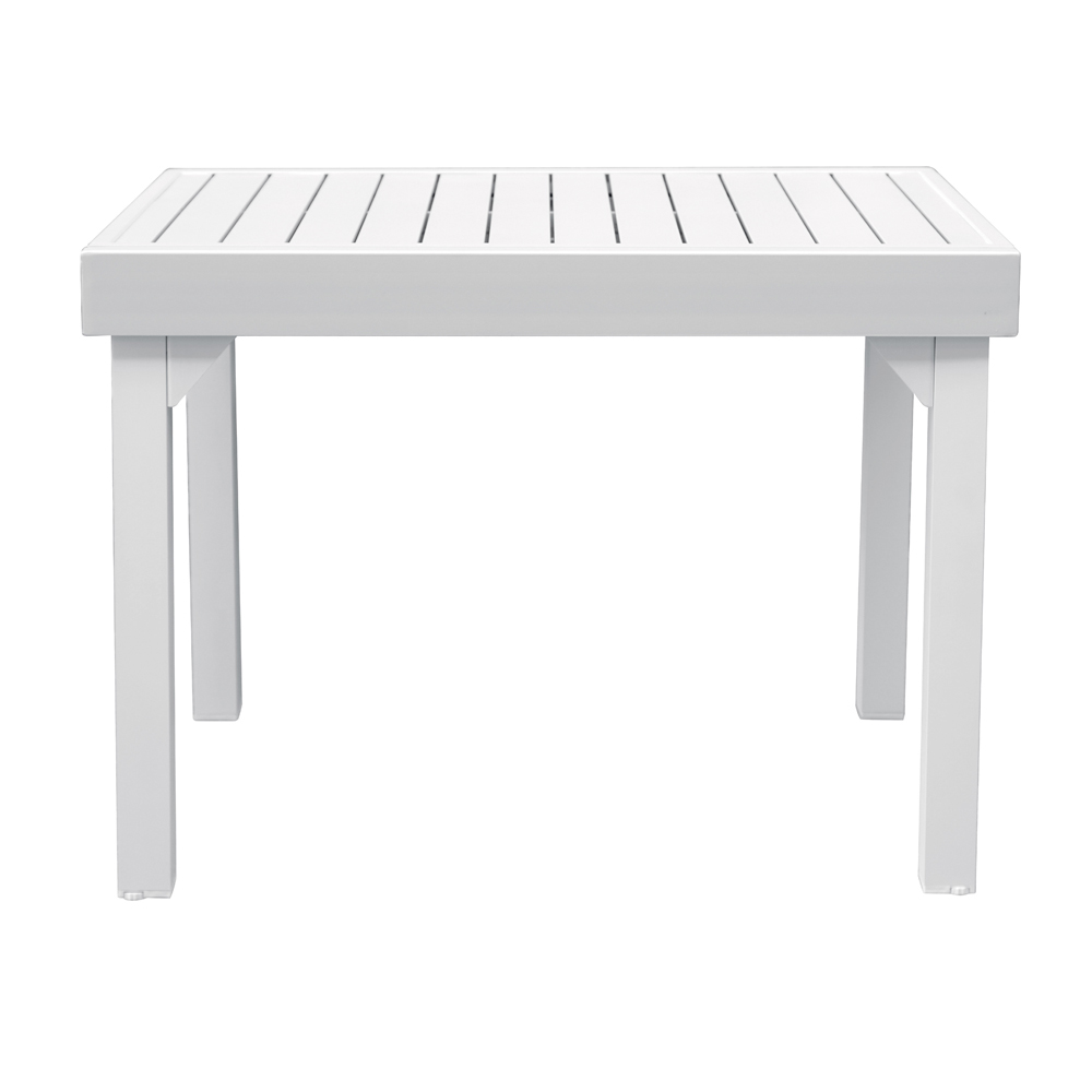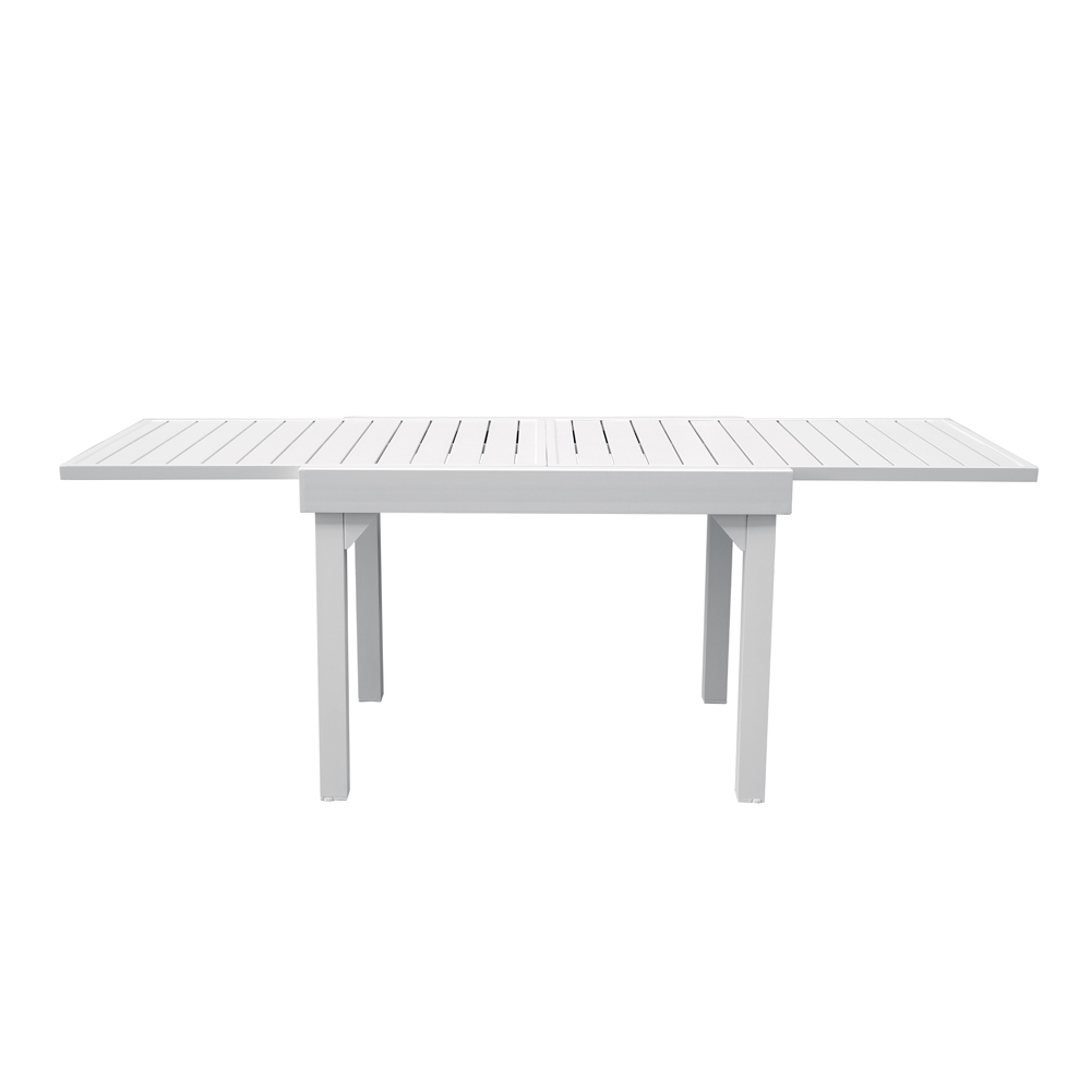 Förbättra stil och funktionalitet till dina utomhusutrymmen med detta vita aluminiumbord med en modern, minimalistisk design. Dess lamellskiva ger det inte bara ett elegant utseende, utan det är också praktiskt, hållbart och lätt att rengöra.